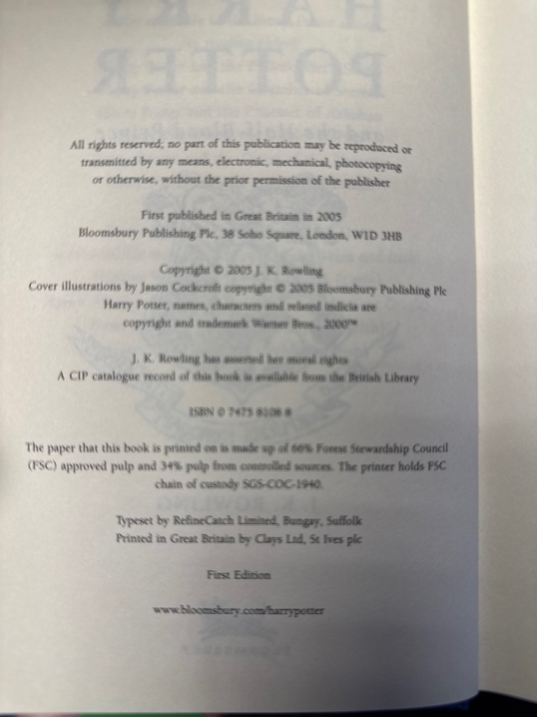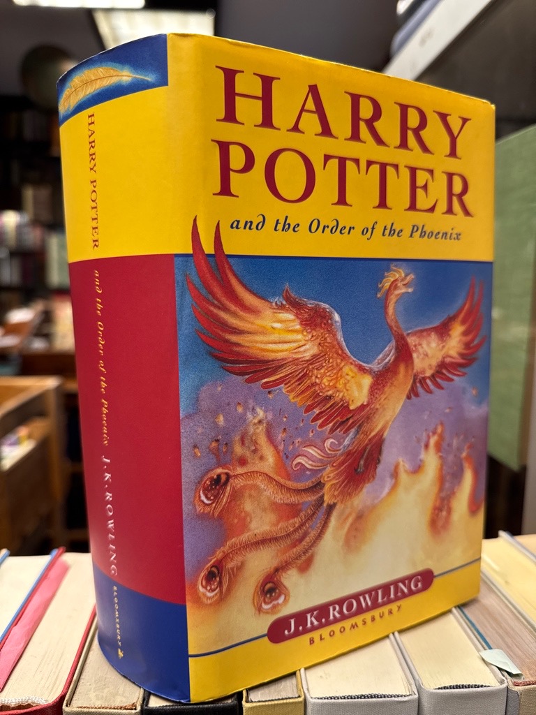 Beide Bände in erster Ausgabe; Erste Ausgabe … Phoenix kenntlich am Abklatsch des Vortitels und Titelblatts auf der gegnüberliegende Seite und nur 766 Seiten plus zwei weisse Blätter, …Half-Blood Prince kenntlich am Druckfehler auf Seite 99 Zeile 9 „Eleven outstanding owls“ soll heißen „10 outstanding owls“ in allen späteren Ausgaben korrigiert. Beide Bände sehr wohlerhalten mit beiden Original-Umschlägen.