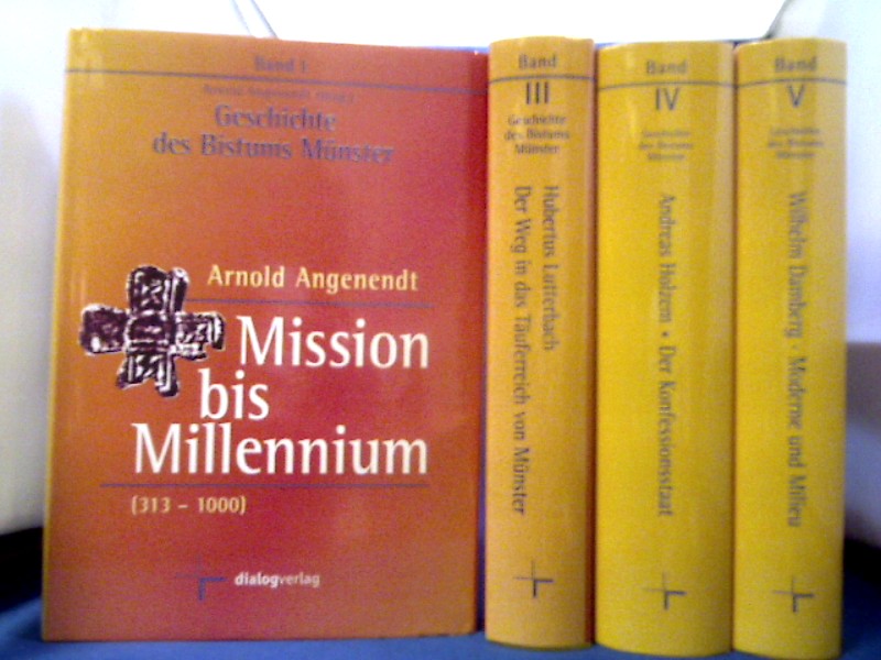 Band 1: Angenendt, Mission bis Millennium, 313-1000. Band 3: H. Lutterbach. Der Weg in das Täuferreich von Münster. Ein Ringen um die heilige Stadt. Band 4: A. Holzem, Der Konfessionsstaat 1555-1802. Band 5: W. Damberg, Moderne und Milieu 1802-1998.