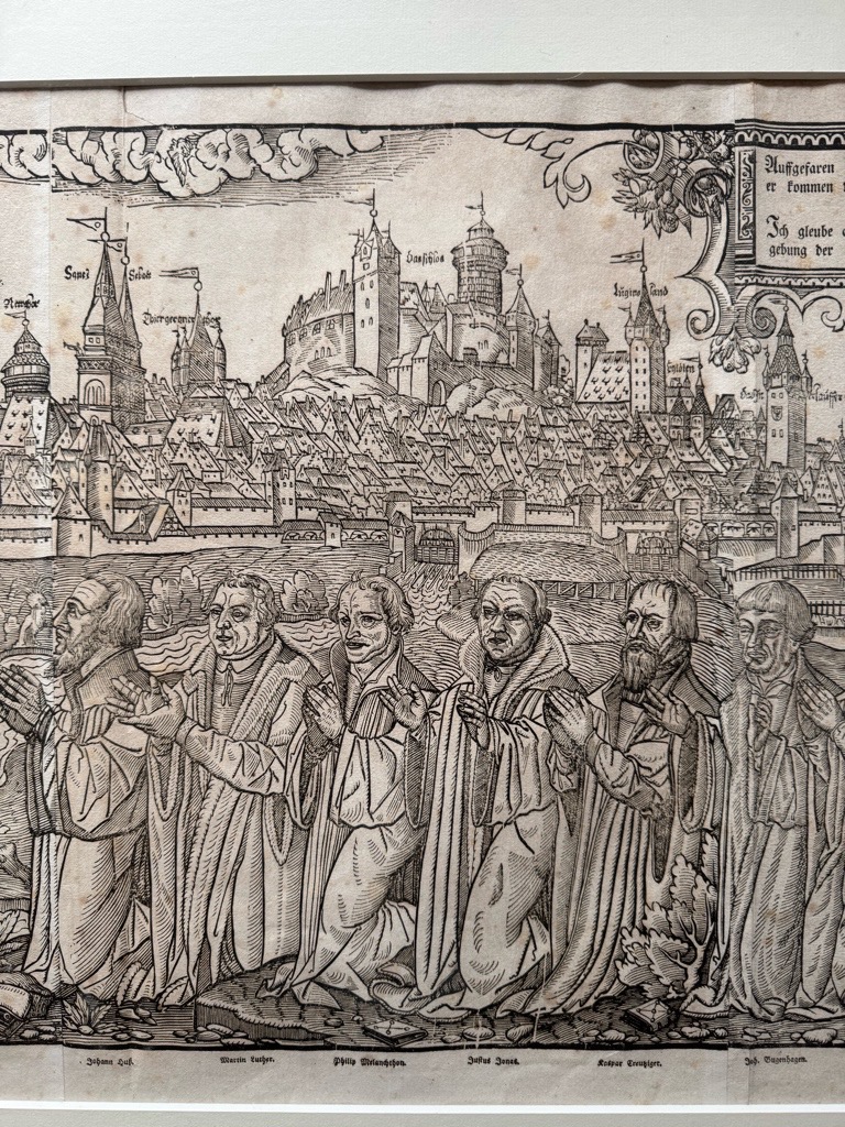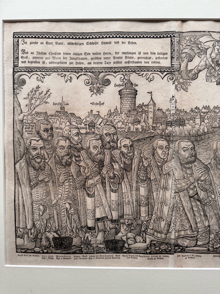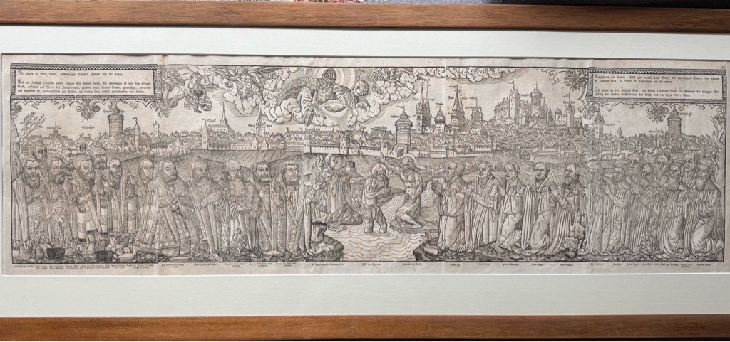 Vgl. Bachmann III, 765, Müller S. 71 u. Fauser 10 029. – Die sog. Reformatoren-Ansicht, bereits mit den runden Türmen an den Toren mit den Jahreszahlen ihrer Erbauung 1556-58. Gerahmt. Die Zeit der Reformation vermutete/verlegte die Taufe Jesu hingegen eher nach Nürnberg an die Pegnitz mit Blick auf damalige Hauptstadt der Reformation. Selbstverständlich ließen sich dieses Ereignis weder die prot. Landesfürsten (zur Linken), noch die Reformatoren (zur Rechten) selbst entgehen, wir erkennen in trauter Eintracht u.a. Luther, Melanchthon, Hus, und viele mehr. Dieser monumentale Holzschnitt zeigt die ganze Szenerie von 5(!!) Holzstöcken gedruckt auf einer Breite von mehr als 1,30 Meter. Wann es gefertigt wurde weiß man, 1559, wer der Künstler ist hingegen nicht genau. Nürnberg. Gesamtansicht (ohne Titel), im Vordergrund mittig Darstellung der Taufe Christi in der Pegnitz, seitlich davon jeweils 13 Porträts in ganzer Figur von Fürsten, Reformatoren und Förderern der Reformation. Anonymer Holzschnitt, um 1560; hier im vermutlich im späteren Abdruck des 17./18 Jahrhunderts.