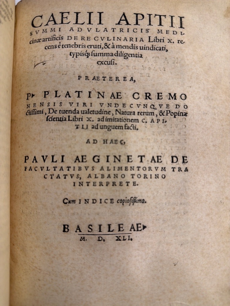 Apicius, Coelius.De re cvlinaria libri X. [Caelii Apitii vmmi adlvlatricis medicinae artificis DE RE Culinaria Libri X. B.] Platinae cremonensis […] de tuenda valetudine, natura rerum et popinae scientia libri X. Pauli Aeginetae de facultatibus alimentorum tractatus, Albano Torino interprete. Angebunden: Hieremiae Brachelii Thriveri Commentarii in VII libros Aphorismorum Hippocratis.