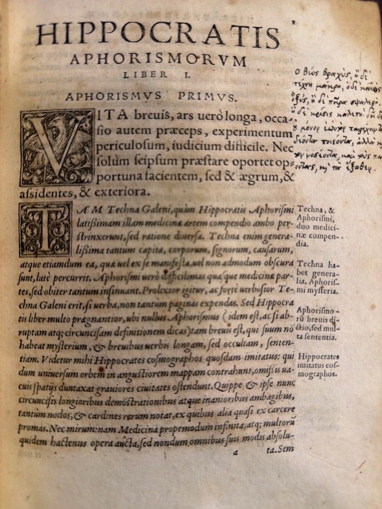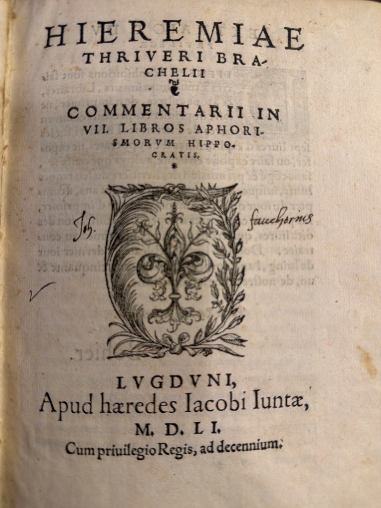 Bitting S. 11; Brit. Mus.; Ebert 1, S. 72 (789); GK 5. 7471; Graesse 1. S. 160; Simon, Bibl. Bacch., 2 Br. 51; Simon, Bibl. gastron., Nr 122; Vicaire Sp. 30; Horn Arndt 7.; Erste Ausgabe – noch vor der häufigeren Ausgabe aus Lyon im gleichen Jahr – des ältesten überlieferten Kochbuchs überhaupt in der Edition in der Edition des Basler Gelehrten Alban Thorer (1489-1559), basierend auf der Handschrift, die dieser 1529 auf der Insel Maguelone bei Montpellier entdeckt hatte. Das Werk der römischen Spätantike ist zugleich das „erste in der Schweiz gedrucktes Kochbuch.“ (Horn/Arndt). Apicius Rezpte sind sehr einfach gehalten und nur mit den Mengenangaben „mehr oder wenig“ wie etwa bei Leber: „In ficato oenogarum: piper, thymum, ligusticum, liquamen, vinum modice, oleum. (Weingarum für Leber: Pfeffer, Thymian, Liebstöckel, Garum, Wein in Maßen und Öl.“ Es hält aber auch einige ausgefallene Speisen parat wie etwa wie Sauzitzen und mit Schweinswurst gefüllte Siebenschläfer. Mit dem sehr ansprechenden Zierstück von Holbein und zahlreichen Holzschnitt -Initialen. S. 193-200 fleckig, sonst sehr wohlerhalten. Vorgebunden ist das Hauptwerk, die „Aphorismen“ des Antiken Mediziners Hippocrates in der gesuchten Kommentar-Edition von Jeremias Thriverius “ Commentarii in VII libros Aphorismorum Hippocratis“ Lyon, Jacques Gunta 1551. Adams 989; BM STC French, 1470-1600, p. 226; Durling, R.J. NLM 16th cent., 1221.; Not in Wellcom; Die sieben Bücher mit über 400 kurzen Aphorismen bilden den „Hippokratischen Corpus“ die Hauptüberlieferung des bekanntesten antiken Mediziners mit berühmten Sätzen wie: Das Leben ist kurz, die Kunst ist lang, die Gelegenheit flüchtig, die Erfahrung trügerisch, das Urteil schwierig.“ Das Titelblatt trägt den zeitgenössischen handschriftlichen Besitzvermerk “ Joh. Faucherius“ der alle lateinschen Aphorismen (und ein Teil der zitierten Kommentare) am Rand mit dem griechischen Original-Text annotiert hat.