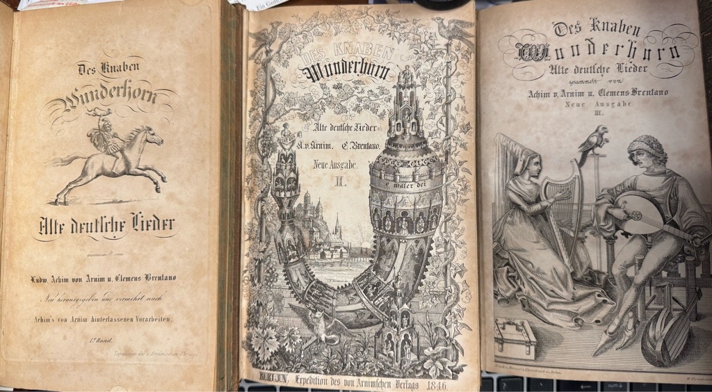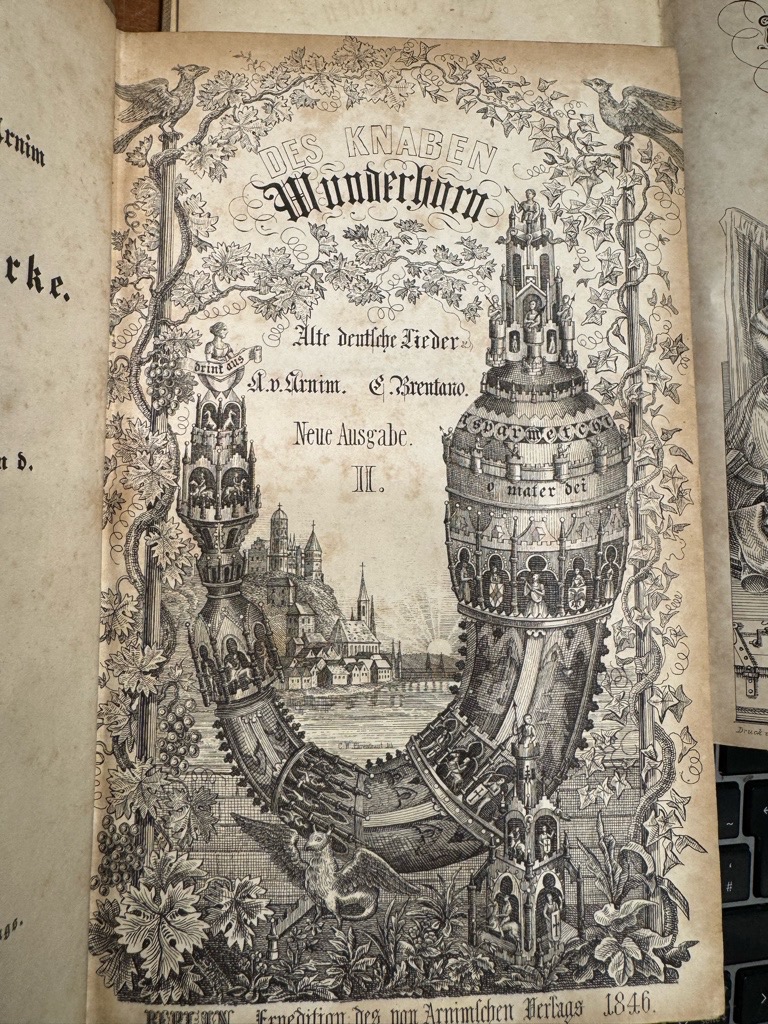 Goedeke VI, 59, 14.; Mallon (Arnim) 190-191 und 194. – Goedeke VI, 59, 14. – Erste Ausgabe der Neubearbeitung und endgültigen Fassung, die als Teil der Gesamtausgabe der Werke Arnims (Bde. XIII, XIV und XVII). Goethe schrieb beim erscheinen: „Das Wunderhorn bleibt der originellste und zugleich letzte Versuch, Volks- und Kunstdichtung, alte und moderne Lyrik, Poesie aller Schichten und Provinzen in einem Gemeinschaftswerk zu einem neuen Ganzen zu verschmelzen. Die Folgen des Werkes sind unermesslich hinsichtlich der Auffassung und Beurteilung des Phänomens ‚Volkslied‘ in aller Welt und hinsichtlich der künstlerischen Rezeption einzelner Lieder, und zwar angefangen bei Arnim und Brentano selbst, über Goethe, Heine und Mörike bis hin zu Arno Holz, bei Weber und Schumann bis hin zu Gustav Mahler und Richard Strauss“ (Ausstellungskatalog ‚Clemens Brentano‘, Freies Deutsches Hochstift, Ffm. 1978, S. 148) „Von Rechtswegen sollte dieses Büchlein in jedem Hause, wo frische Menschen wohnen, zu finden sein, um aufgeschlagen zu werden in jedem Augenblick der Stimmung oder Unstimmung.“.