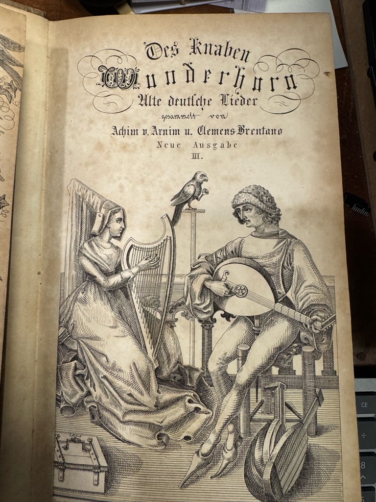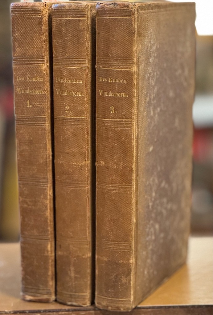 Goedeke VI, 59, 14.; Mallon (Arnim) 190-191 und 194. – Goedeke VI, 59, 14. – Erste Ausgabe der Neubearbeitung und endgültigen Fassung, die als Teil der Gesamtausgabe der Werke Arnims (Bde. XIII, XIV und XVII). Goethe schrieb beim erscheinen: „Das Wunderhorn bleibt der originellste und zugleich letzte Versuch, Volks- und Kunstdichtung, alte und moderne Lyrik, Poesie aller Schichten und Provinzen in einem Gemeinschaftswerk zu einem neuen Ganzen zu verschmelzen. Die Folgen des Werkes sind unermesslich hinsichtlich der Auffassung und Beurteilung des Phänomens ‚Volkslied‘ in aller Welt und hinsichtlich der künstlerischen Rezeption einzelner Lieder, und zwar angefangen bei Arnim und Brentano selbst, über Goethe, Heine und Mörike bis hin zu Arno Holz, bei Weber und Schumann bis hin zu Gustav Mahler und Richard Strauss“ (Ausstellungskatalog ‚Clemens Brentano‘, Freies Deutsches Hochstift, Ffm. 1978, S. 148) „Von Rechtswegen sollte dieses Büchlein in jedem Hause, wo frische Menschen wohnen, zu finden sein, um aufgeschlagen zu werden in jedem Augenblick der Stimmung oder Unstimmung.“.