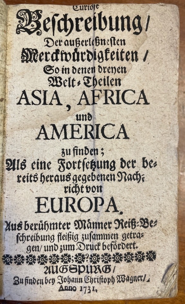 VD18 14402521; Seltene Beschreibung von Asien, Afrika und America. Der vordere Deckel ist längst zur hälfte abgebrochen, das Frontispiz stärker angerändert und die letzten zwei Blatt Register mit Wurmgang, im Ganzen etwas unfrisch.