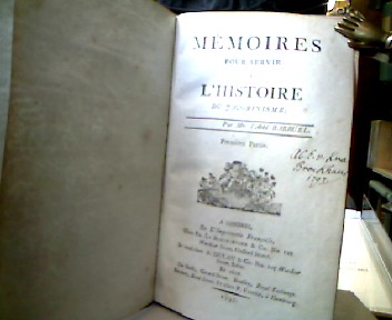 Wolfstieg I, 6367; Caillet I, 772; Erster Band der ersten Ausgabe des berühmten Werkes des Jesuiten Augustin Barruel (* 2. Oktober 1741 in Villeneuve de Berg, heute zum Département Ardèche; 5. Oktober 1820 in Paris). Barruel vertritt mit großer Vehemenz die These, daß die Französische Revolution Ergebnis einer Verschwörung von Jakobinern, Aufklärungsphilosophen, Freimaurern und schließlich der Deutschen Illuminaten sei (u.a. Voltaire, Friedrich II., die Enzyklopädisten uvm.) Schon auf Seite 6 legt er damit los: In der französischen Revolution [