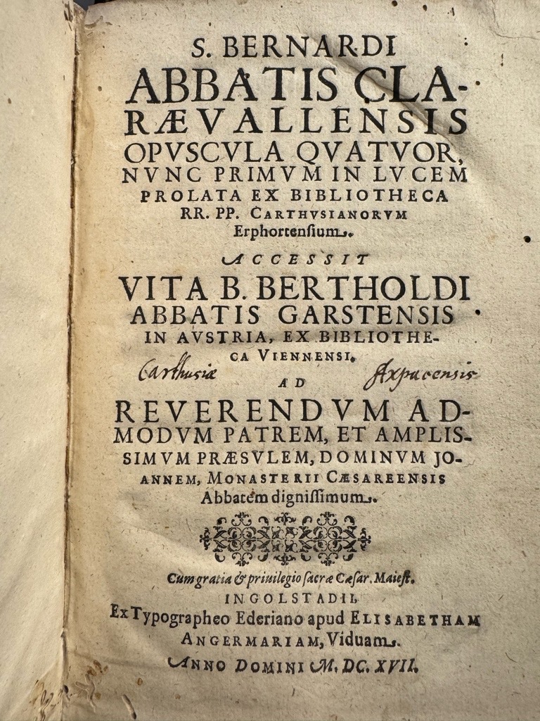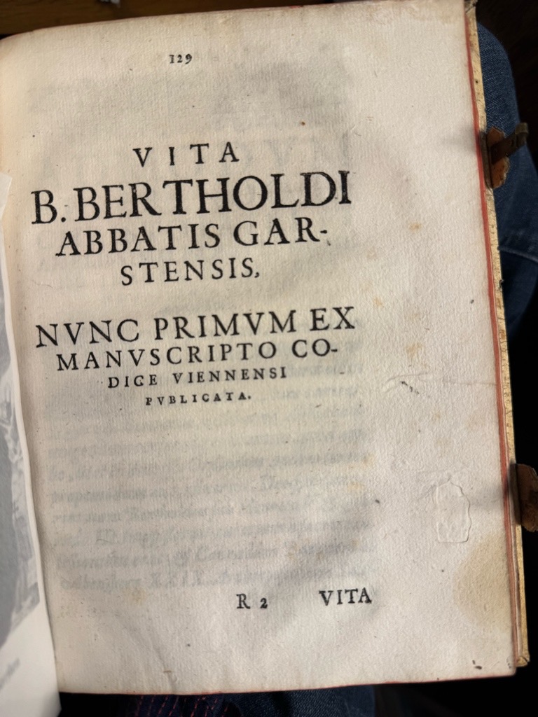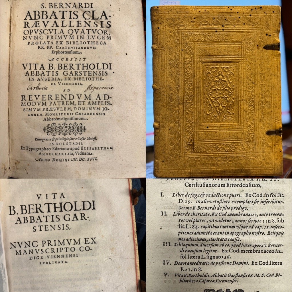 I. Liber de fuga & reductione pueri. Ex Cod.in fol lit. D. 19. In alio vetustiore exemplari fic inferibitur. Sermo B. Bernardi de filio prodigo.II. Liber de charitate. Ex Cod membranaceo, ante trecentos velplures, ut videtur, annos fcripto; in 8.fub fit. L. 84. capitibus tantum ufsque ad cap. 12.infscriptiones adiunctae erant in apographo noftro. Reliquis nos adiecimus, claritatis cauffa. III. Soliloquium, diverfum ab eo, quod inter opera S. Bernardi excufum legitur. Ex Cod.membranaceo in. fol.litera L.fignato 26. IV. Devot a meditatio de paßione Domini. Ex Cod litera F.21.in 8. Vita B.Bertholdi Abbatis Garftenfis ex M. S. Cod. Bibliotheca Cafareae, Viennenfis.