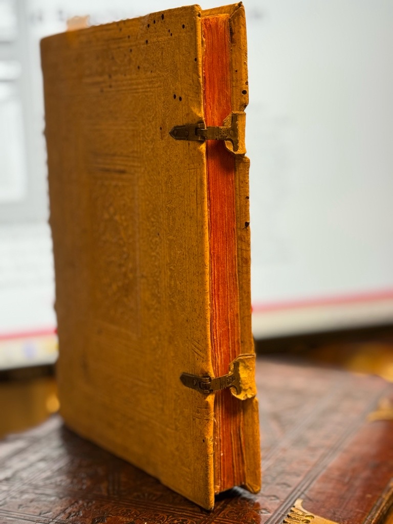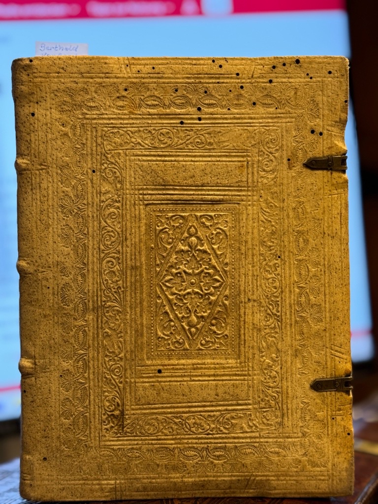 185 Bll. Quarto, Blindgeprägter Schweinslederband mit zwei intakten Schliessen.