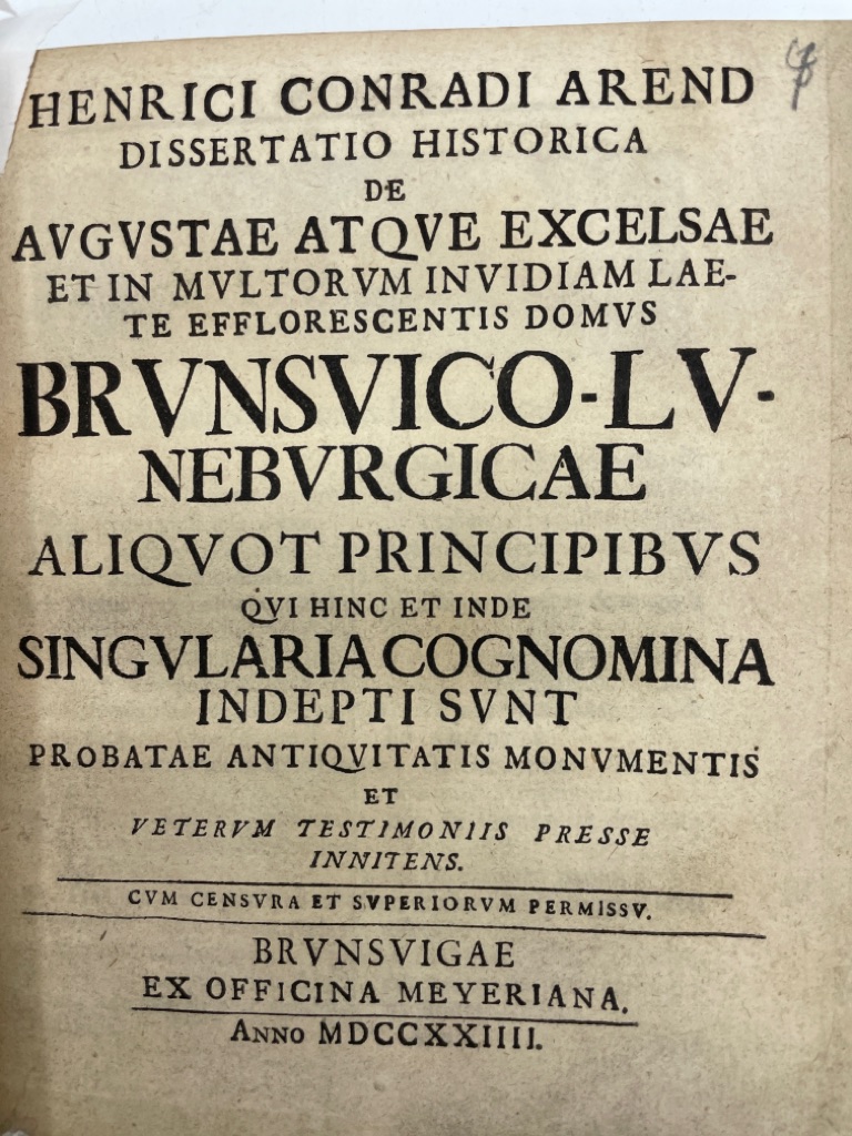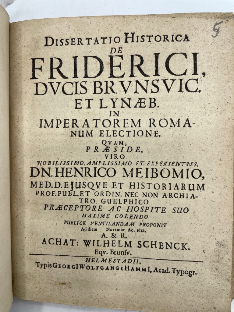 1. Leyser, P.: Sigilum Maiestatis Brunsvicense. Praelectionibus Publicis in Historiam Universalem. Helmstedt (Schnorr) 1725. Mit 1 Titelvignette des Löwen. 12 SS. – Angebunden: 2. Sagittarius C. und P. Floto: Origines Serenissimorum Ducum Brunswico-Luneburgensium. Jena 1684. Mit Mit 2 kleinen Titelvignetten, darunter Stadtansicht von Wolfgenbüttel. 6 Bll. 144 SS. – Angebunden: 3. Sagittarius, C.: Introitus et Exitus Salfeldensis… I. De miseria praeceptorum scholae. II. Valedictoria ostensus. Accedit Mechaelis Neandri graeci carminis de miseria. Et contemptu una etiam dignitate et gloria praeceptorum publicorum versio latina. Et programma auctoris de vita sua. Jena ca. 1700. 2 Bll., 32 SS. – Angebunden: 4. Arend, H.C.: Dissertatio Historica de Augustae atque exelsae et in multorum invidiam laete efflorescentis domus Brunsvico-Luneburgicae aliquot pricipibus qui Hinc et inde Singularia cognomina indepti sunt probatae antiquitatis monumentis et vetrimtestimoniis presse innitens. Braunschweig 1724. 95 SS., 4 Bll. – Angebunden: 5. Meibom, H.:Dissertatio Historica de Friderici, Ducis Brunsvic. et Lynaeb. in imperatorum romanum electione. Helmstedt ca. 1682. 16 Bll. – Angebunden: 6. Dissertatio Saecularis de Ernesto Duce Brunsvicensi et Luneburgensi, Principe Sapiente, Pio, Forti, Felici, Augustanae confessionis assertore et vindice, quam in memoriam Augustissimae confessionis bina ante saecula anno MDXXX DIE IVNII imperatori Carolo V. exhibatae in iillustri gymnasio Gottingensi praeside Henrico Philippo Gudenio…Göttingen ca, 1720. 2 Bll. 148 SS. – Angebunden: 7. Kripner, S.: Origines Urbis S. Georgii ad lacum vulgo Der Brandenburger vocatae in illustri collegio Christian-Ernestino…Oratione Solemni.. Bayreuth ca, 1720. 3 Bll., 51 SS. – Angebunden: 8. Helmstedt. Eccard, J.G.: Programma de Antiquissimo Helmstadii Statu, lectionibus publicis, cum Historiae Gemanicae lineamenta auspicaretur, praemissum. Helmstedt (Hamm) 1709. Mit 1 gefalteten Kupferstichkarte von Arnold Nicolai und 4 Stadtplänen als Randleisten. 11 Bll. – Angebunden: 9. Senckenberg, H.C. Disquisitio de Feudis Brunsvicensibus et Luneburgicis. Fide monumentorum hic ex originibus additorum et usus. Göttingen 1738. Mit 1 kolorierten Uniformtafel (Herzog von Braunschweig). 4 Bll., 32 SS. LXII SS.