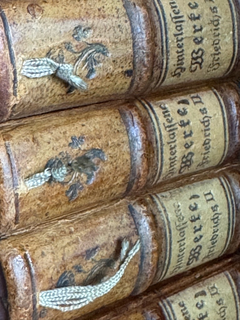 Brieger 548. Fromm VI, 27899. Erste Ausgabe der Schriften des „alten Fritz“. Ein buchbinderisches Unikat, da knapp unterhalb des oberen Kapitals ein Band als Zug-Lasche aus dem Rücken ragt, wohl um die einzelnen Bände ohne Beschädigungen aus dem Regal zu ziehen. Wir konnten kein zweites Exemplar mit dieser Besonderheit nachweisen.