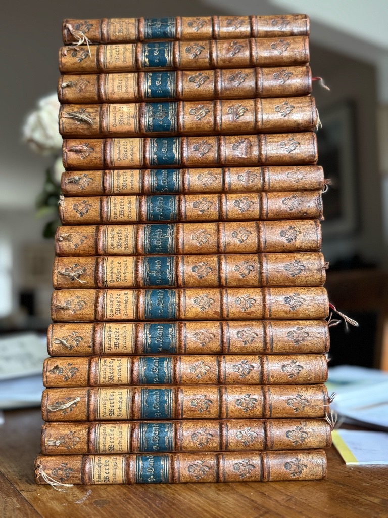 Mit dem gestochen Portrait-Frontispiz von Bolt nach F. C. Frisch. . Sehr dekorative, einheitliche Halblederbände der Zeit über fünf Bünden mit je zwei unterschiedlich farbigen Titelrückenschildern