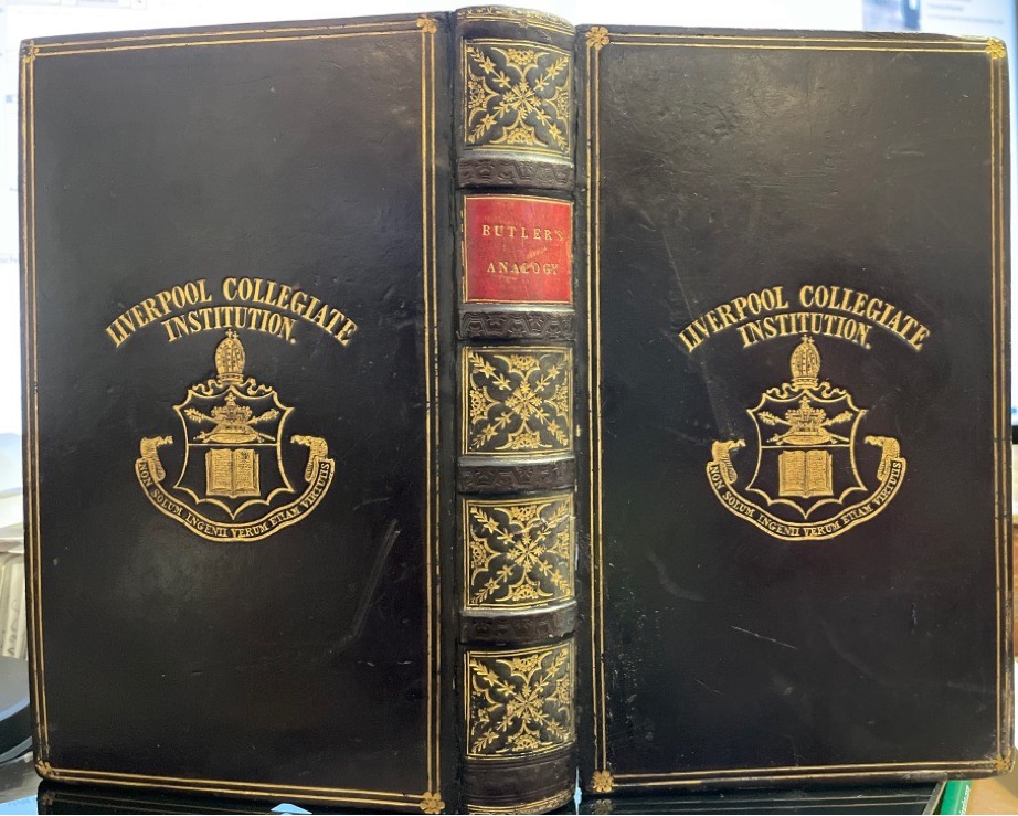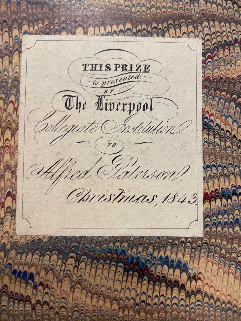 lxx, 384 pS. Signierter nachtschwarzer Ganzledereinband über vier Bünden mit farbigem Titelrückenschild, reichlicher Goldverzierung goldgeprägtem Wappensupralibros des „Liverpool Collegiate Institutions“ auf beiden Deckeln und Widmungsblatt auf dem Innendeckel „This Prize… to Alfred Patterson … 1843“