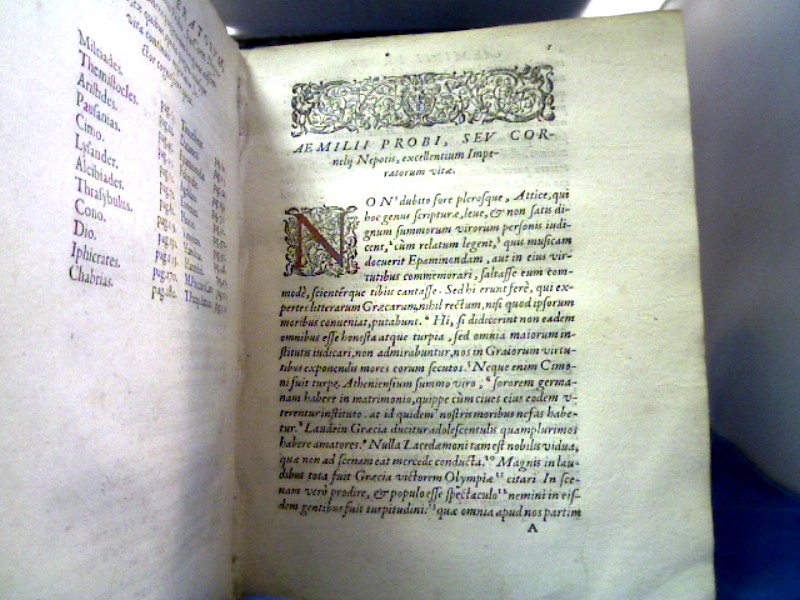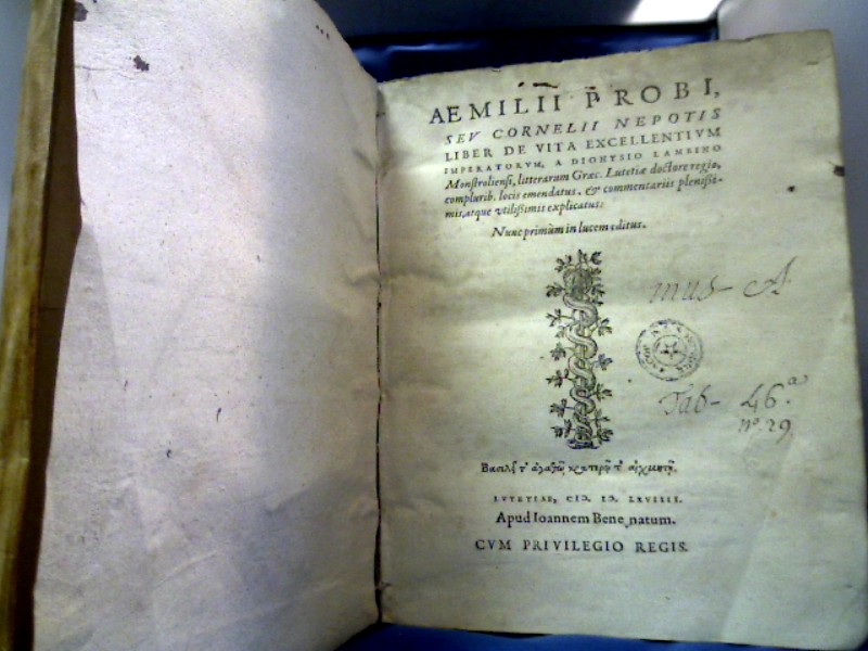 Ebert 5256 ; Graesse II, 279; Schweiger II, 2, 297; „L`s Anmerkgg. werden sehr geschätzt, Lambin war der erste, welche diese Lebensbeschreibungen dem Cornelios Nepos zuschrieb.“ Gesuchte Ausgabe mit erstmaliger Zuschreibung diese Textes an C. Nepos. Die ersten nn Bll. oben mit Fleck und kleinem Wumrgang außerhalb des Textes. Alter dezenter Stempel auf dem Titelblatt und verso Titel.gestochenes Wappenexlibris.