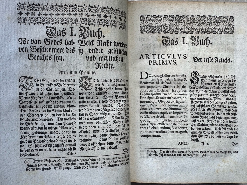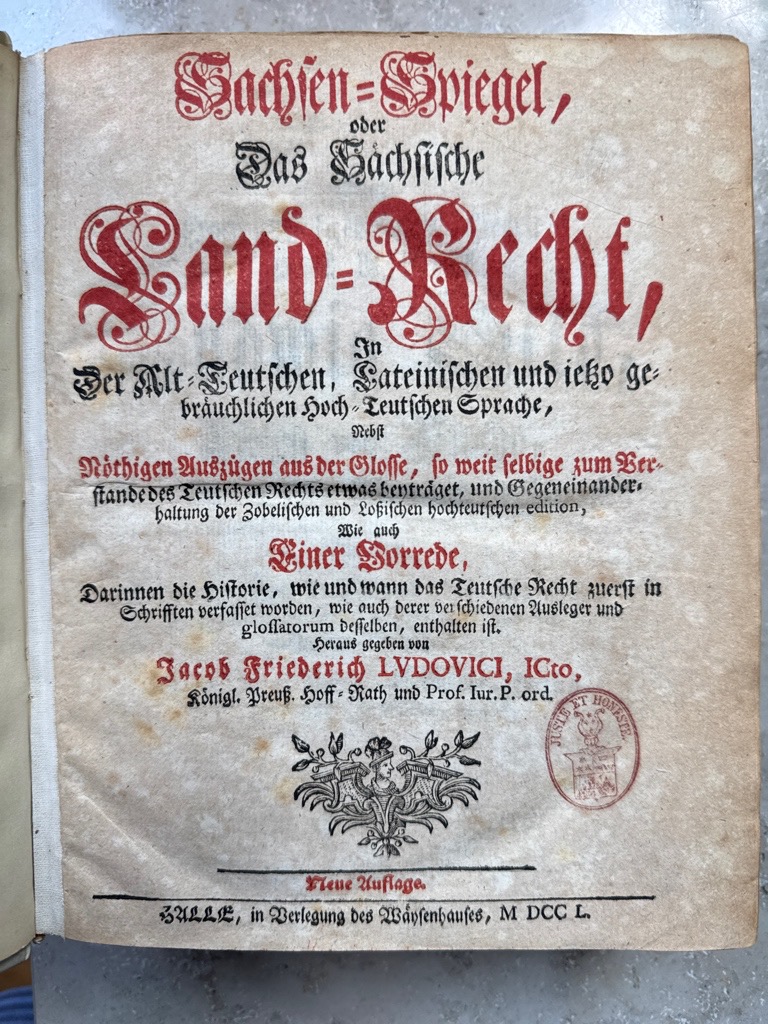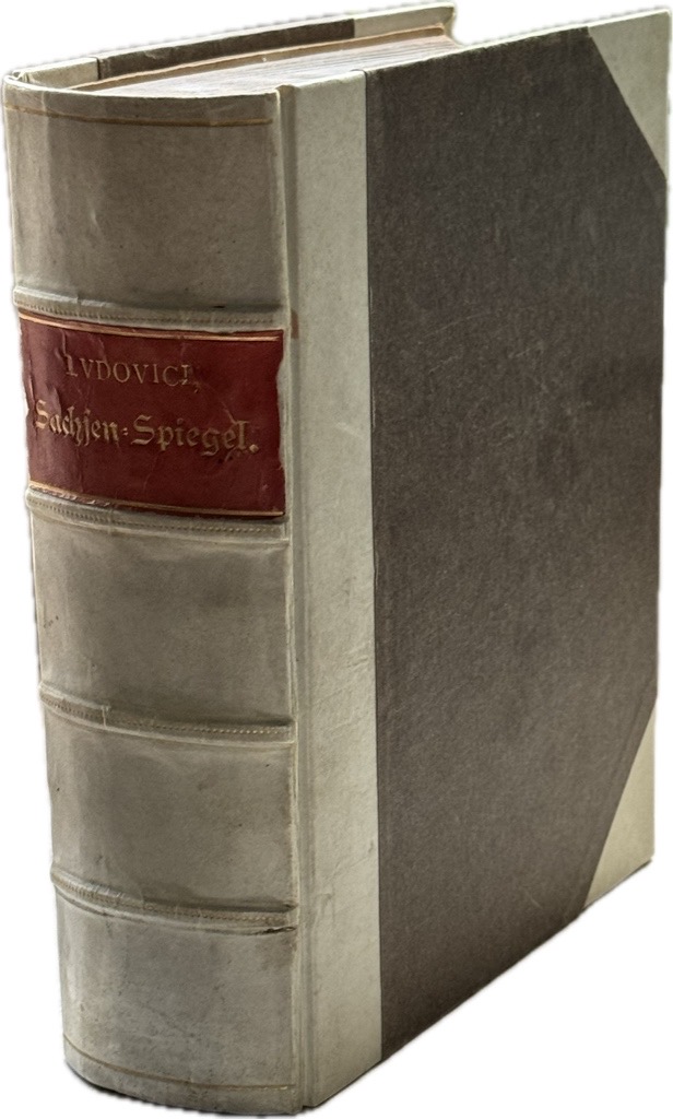 Graesse VI, 1, 207; Der Sachenspiegel, ursprünglich von dem Schöffen und Richter Eike von Repgow am Anfang des 13. Jahrhunderts lateinisch kompiliert, fand rasch weiteste Verbreitung und bildet die Grundlage für eine größere Zahl von Rechtsbücher. In vier Spalten sind die älteste niederdeutsche Fassung, die niederdeutsche Fassung der Zobelschen Ausgabe, die lateinische, sowie die Hochdeutsche Fassung wiedergegeben. Das Ganze ist durch ein Glossar und zwei Register erschlossen. Die Heftung minimal gelockert, dezenter historische Bibliotheksstempel auf dem Titelblatt, ein sehr schönes sauberes Exemplar.