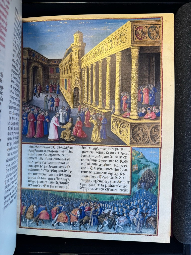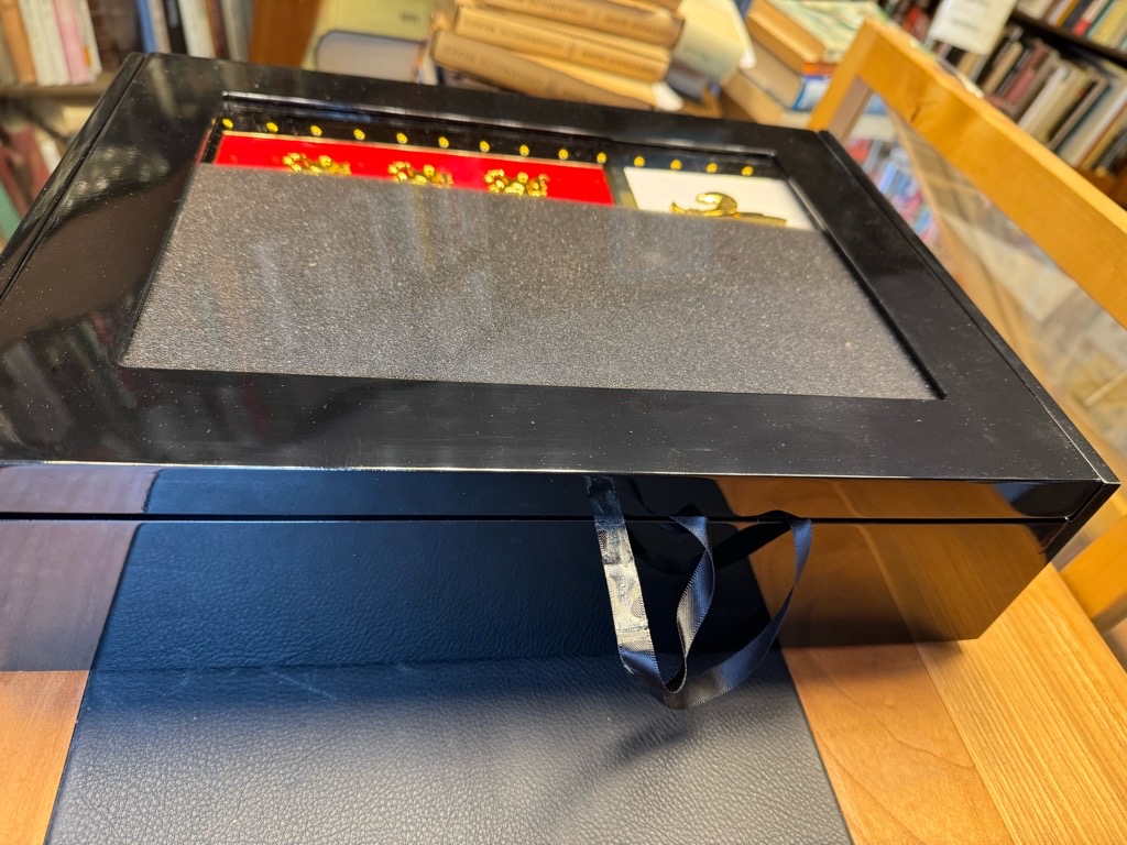 Rotes genarbtes Original-Leder mit einem prachtvollen VDeckel-Emblem gestaltet in den Kreuzritterfarben Rot und Weiss mit goldenem Rahmen und der französischen Konigslilie sowie den Löwen in Gold verziert bzw. graues OLeinen, zusammen in schwarzer Lackkassette mit Glasfenster. (die Kasette hinten mit minimaler Fehlstelle.)
