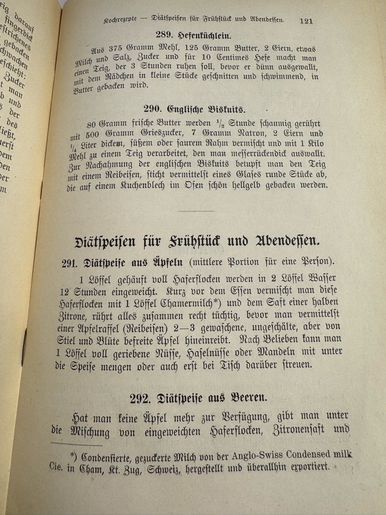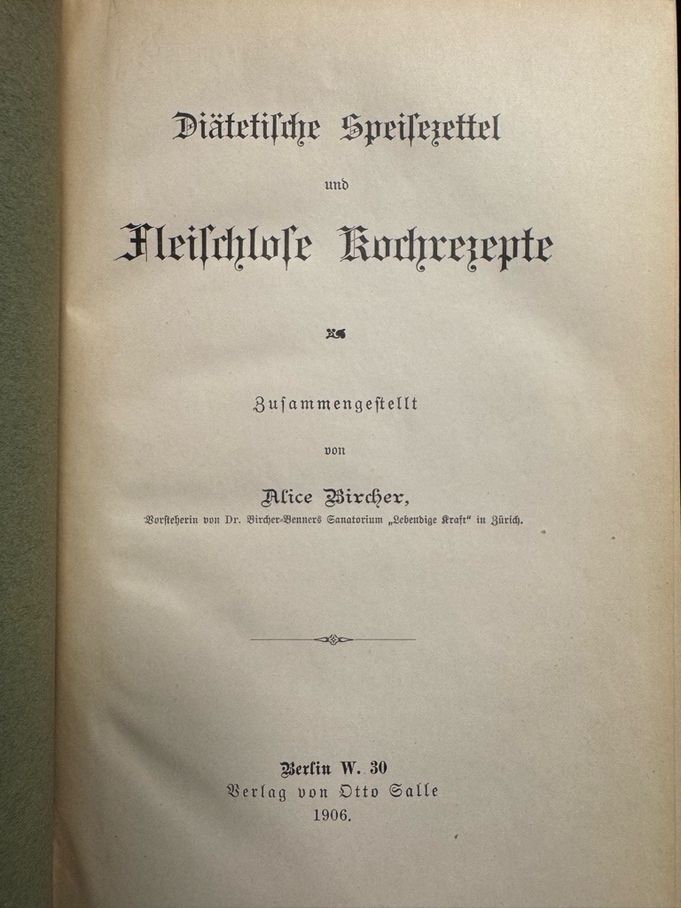 Weiss 397; Erste Ausgabe des sehr seltenen vegetarischen Kochbuches in sehr gutem Erhalt. Alice von Brasch-Bircher (Aarau,1879Livland,1916)[3]. Mutter von Dagmar Liechti-von Brasch. 18971907 hauswirtschaftliche Leiterin im «Sanatorium Lebendige Kraft». Ihr Bruder Maximilian Bircher-Benner, der Leiter des Sanatoriums, gilt -wohl mit seiner Schwester- als „Erfinder“ des Bircher Müslis, das wir in diesem Buch zum ersten Mal in gedruckten form finden.