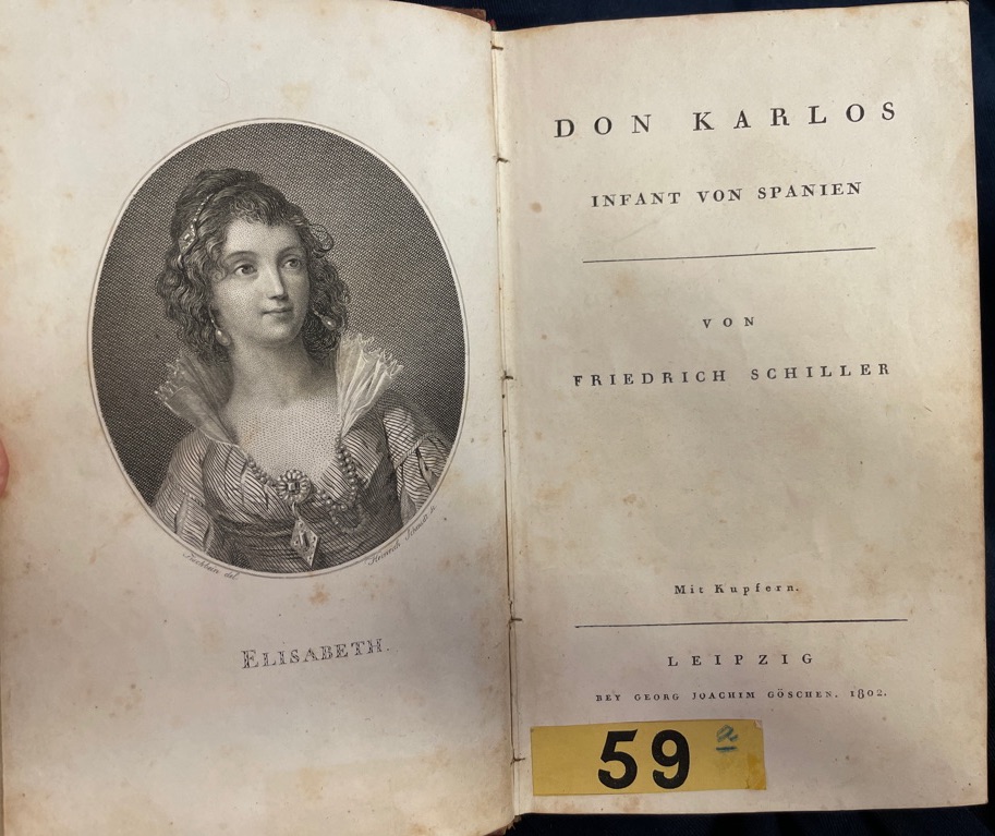 Goedeke V, 181, 10.; Marcuse 229; Prachtausgabe. »Was lag für den Ehrgeiz Göschens näher, als das Werk seines Freundes Schiller, mit dem zusammen er 1785 die Wohnung in Gohlis geteilt hatte, als ein Non plus ultra der Typographie zu drucken: den Don Karlos, dessen Entstehung er miterlebt hatte.« 1801 lieferte Schiller die revidierte Textfassung ab und Göschen begann mit Satz und Druck, allerdings nur, wenn Göschen selbst in Grimma anwesend war. Druck auf festem Papier.. Nach Fertigstellung des Buches schrieb Schiller an den Verleger Crusius: »Die neueste Ausgabe des D. Karlos bei Göschen ist das schönste, was ich in dieser Art kenne«. (vgl. Paul Raabe, Schiller und die Typographie der Klassik, in: Imprimatur NF 2, S. 154ff.). 22,0 : 14,5 cm. Deckel und Rücken etwas berieben, kleiner privater Nummeraufkleber auf dem Titel, die Kupfer vereinzelt etwas fleckig. Zeitgenössischer handschriftlicher Besitzvermerk „Rebecca Coleman (1807) present from her Brother Franzis,“