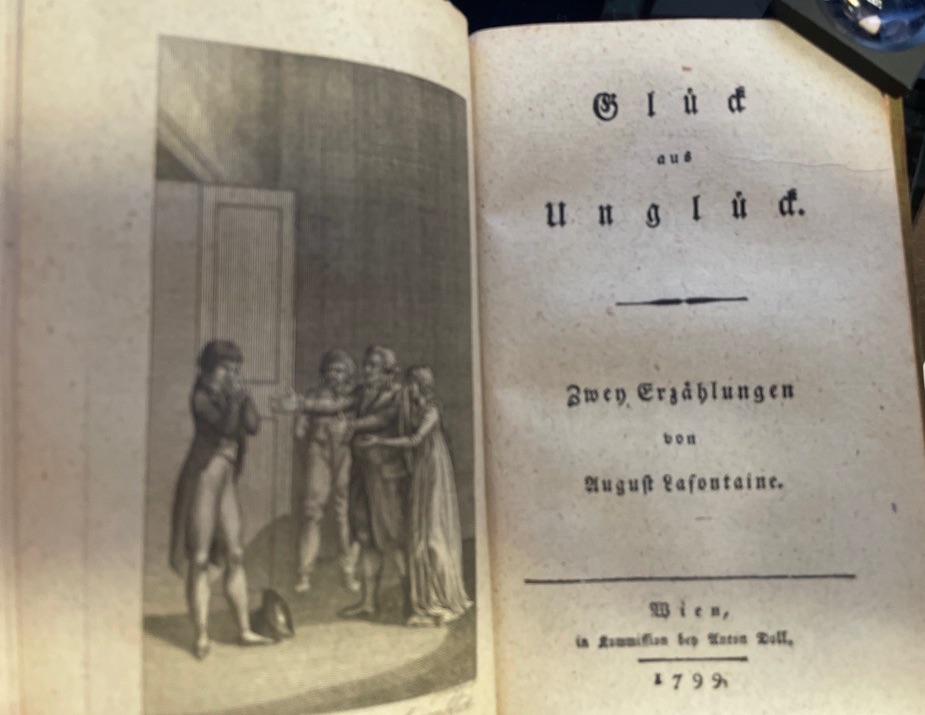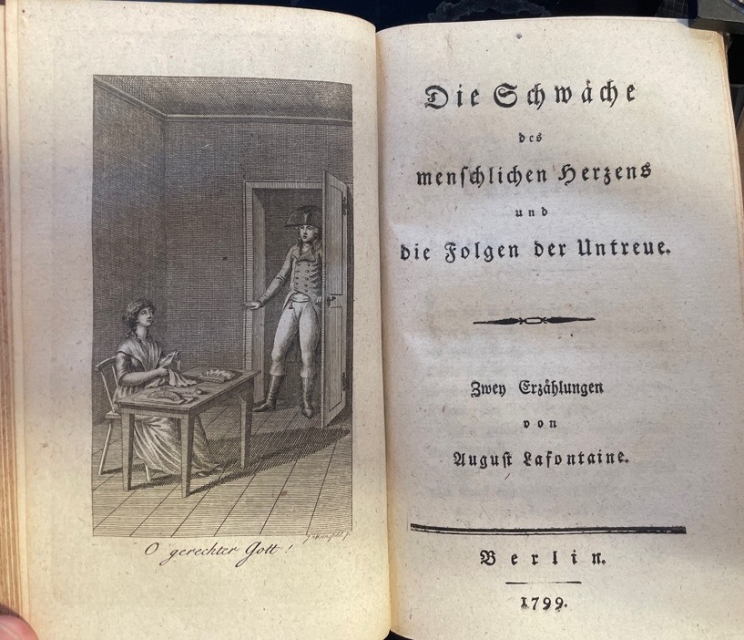 94 Seiten mit Titelkupfer 1 Bl. Verlagsanzeigen; szenisches Frontispiz 120 S.; Szenisches Frontispiz, 118 S. Kl.-8° Pappband der Zeit mit Rückentitel (oberes Kapital etwas beschädigt, sonst sehr gut erhalten.