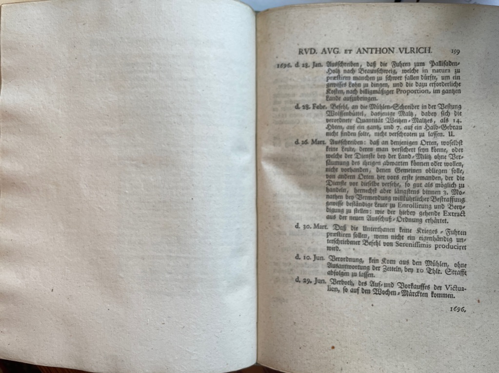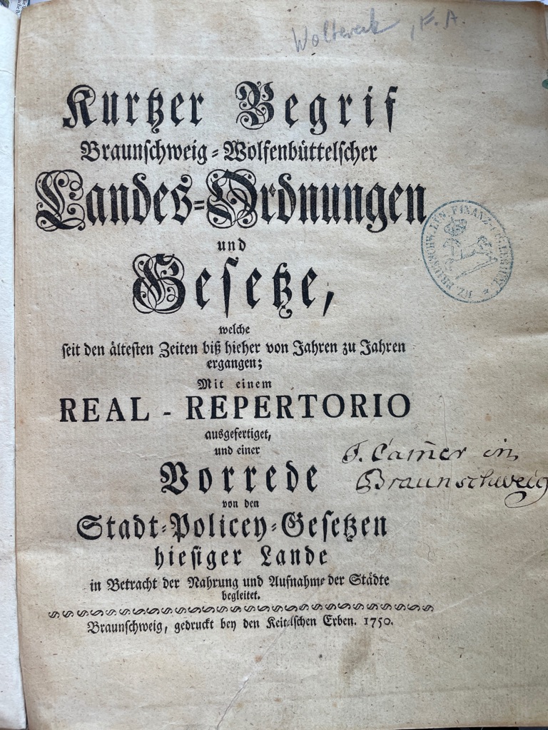Woltereck, Friedrich Adolph und Joachim Dietrich Liechtenstein.Kurtzer Begrif Braunschweig-Wolfenbüttelscher Landes-Ordnungen und Gesetze, welche seit den ältesten Zeiten biß hierher von Jahren zu Jahren ergangen. Mit einem Real-Repertorio ausgefertiget, und einer Vorrede von den Stadt-Policey-Gesetzen hiesiger Lande in Betracht der Nahrung und Aufnahme der Städte begleitet.