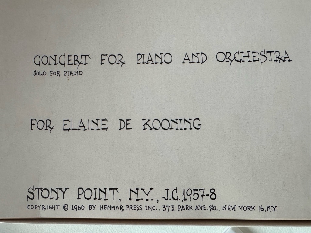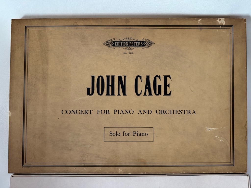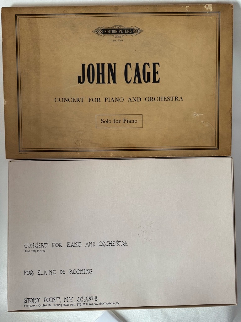 Erste Ausgabe der Partitur von John Cage mit handschriftlicher Widmung von JOHN CAGE to „Lee“. Die Wimungsträgerin ist höchst wahrscheinlich die ungarisch-amerikanische Künstler Sari Dienes (geborene Sarolta Maria Anna van der Lee), eine enge Freundin und Nachbarin von John Cage und Merce Cunningham, die im Freundeskreis oft „Lee“ genannt wurde. Dienes beinflusste Cage stark durch ihre experimentelle Arbeiten mit Alltagsgeräuschen und Materialien. (Vgl. Correspondence from John Cage to Sari Dienes, Digital Collections Northwestern Universities und Sari Dienes Foundation). Das Werk ist im Titel der weltbekannten US-amerikanischen Künstlerin Elaine de Kooning gewidmet. Die Box im ikonischen Peters Design mit sehr leichten Gebrauschspuren, bzw Lichtrand, die handschriftliche Widmung verblasst. Sehr selten, mit dieser bedeutsamen Widmung unikal.