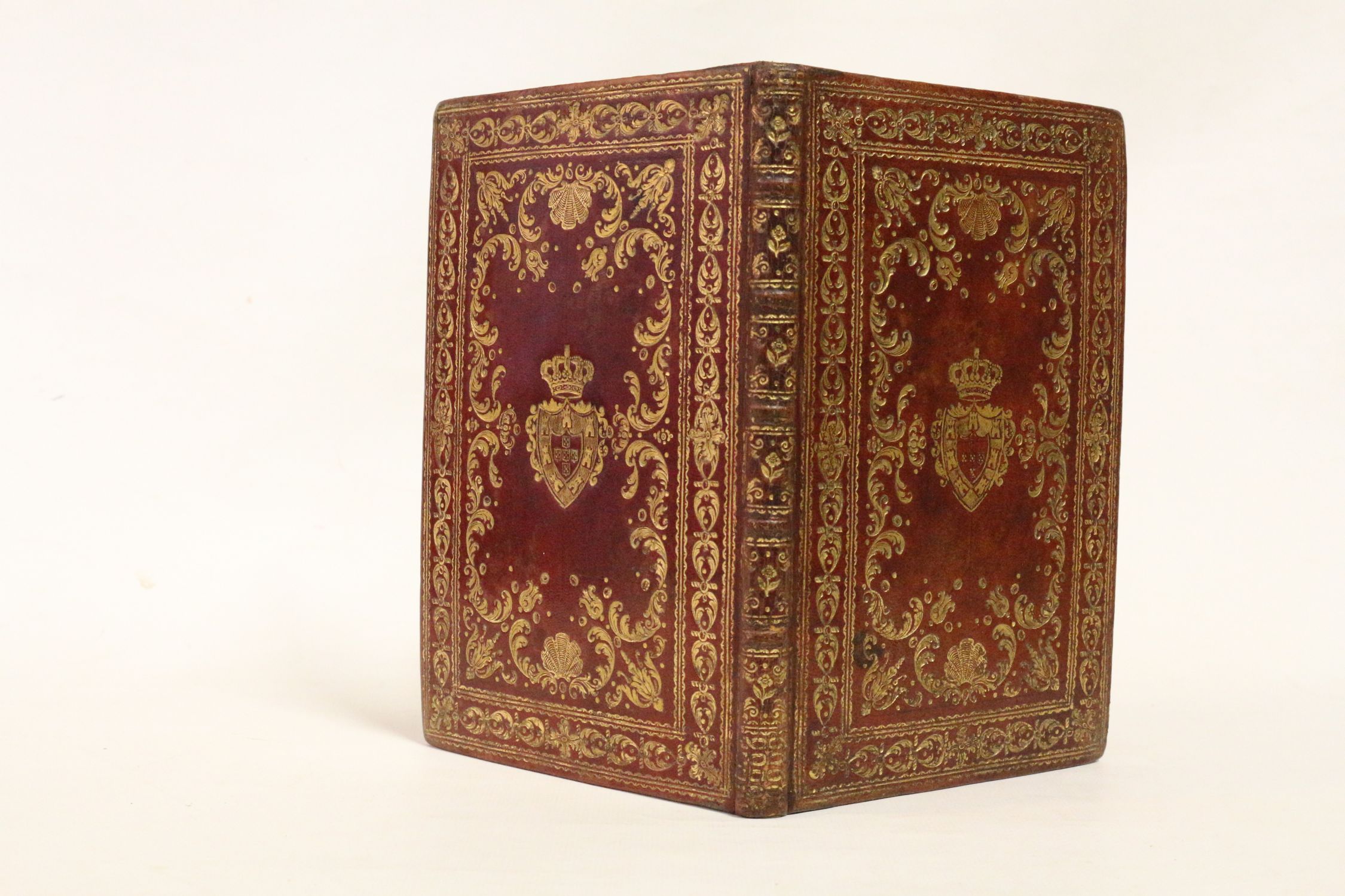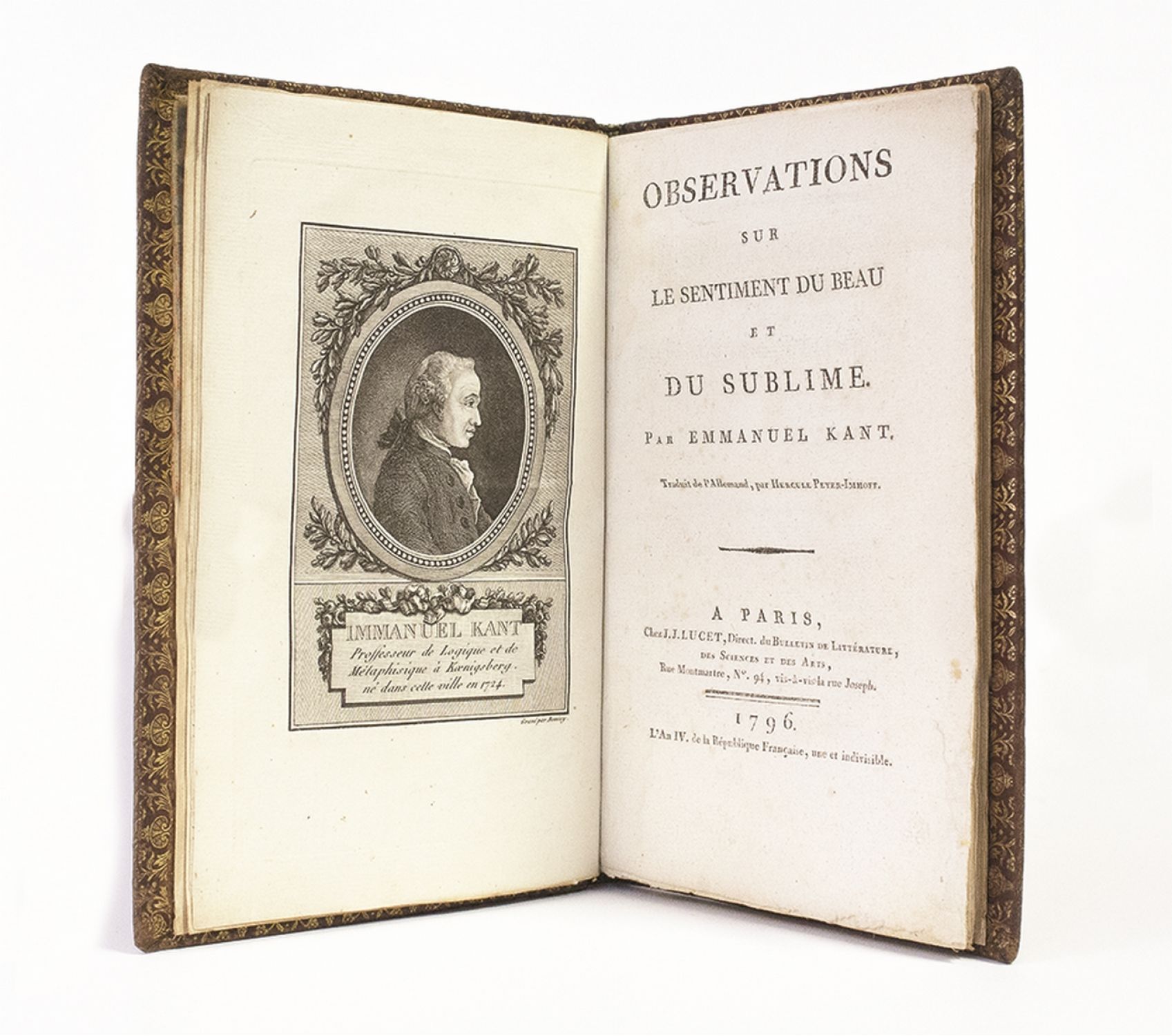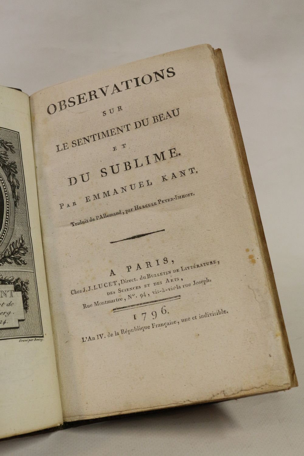 Hatchuel, P. Bibl. Kant en Francais 1. Première édition française dans la traduction de Jean-Marie Hercule Peyer-Imhoff. Portrait de Kant gravé par J. Beniry dit Dubuisson. Pour le portrait : Inventaire du fonds français après 1800, Cabinet des estampes, BnF, 1937, Vol. II, p. 185. [BnF R-12294]Extremely rare first edition of the first French translation of one of Kant’s philosophical work and the second translation of a text by Kant, the others will only be known to the non-German speaking audience during the nineteenth century. In fact, the same year a short political text entitled Projet de paix perpétuelle appeared. Our edition is illustrated with a portrait of the author by J. Beniry, known as Dubuisson. The first edition, written in German under the title Beobachtungen über das Gefühl des Schönen und Erhabenen, was published in 1764 in Königsberg. Our copy is rebound in a full brown morocco binding from The King of Portugal 18th century, spine in five false bands richly decorated, boards framed with roll-tooling and a gilt dentelle as well as a third frame of scroll-work and scallops, royal coat of arms in the centre of the boards. The book contains the philosopher’s first observations – who until then had only published scientific texts – on aesthetics and more particularly the sublime, a concept that will acquire all its significance in Critique du jugement (1790). This, like most of the philosopher’s work, will only be translated during the nineteenth century. «Certainly before 1781, the name Kant was not totally unknown at the University of Strasbourg where some students and professors had cited him in their research or in their courses, and the work of the Berlin Academy, containing the memoires of resolute Kantism opponents, was not completely ignored in France, but it was not until the French Revolution and even the end of the Convention and the beginning of the Directory, that is to say, nearly fifteen years after the Critique de la Raison pure was published, that Kant and his work was beginning to be talked about in France.» (Jean Ferrari, L’uvre de Kant en France dans les dernières années du XVIIIème siècle in Les Études philosophiques No. 4, Kant (October-December 1981), pp. 399-411). We have not found any mention of this work being offered for public sale with the exception of Baron Talairat’s copy (6 March 1877) and that of Mr d’Ansse de Villoison (3 March 1806).