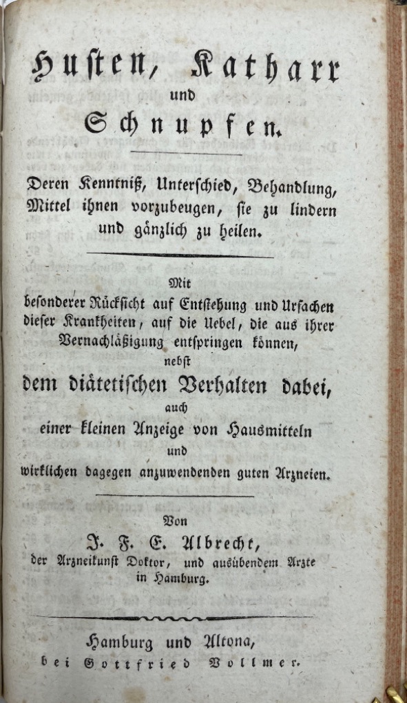 Fieber, Katharr, Schnupfen-Buch etc. vom Arzt Buchhändler, Schriftsteller und Schiller-Freund Albrecht aus Hamburg.