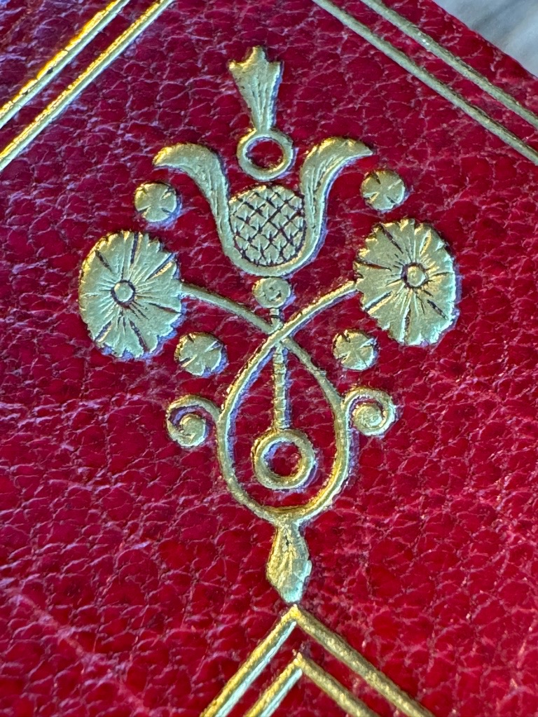 Mit 2 gestochen Frontispizen und zahlreichen Textkupfern, Vignetten und Initialen. 16 Bll., 264 S., 1 Bl.; 12 Bll., 191 S., 7 Bll. Text, Verzierungen und Illustrationen durchgehend von Kupferplatten gedruckt. Rote Ganzmaroquin-Handeinbände mit reicher Deckel- Steh-und Innenkantenvergoldung (signiert Reviere & Sons). (Bd. 1 mit sehr leichten Kratzspuren).