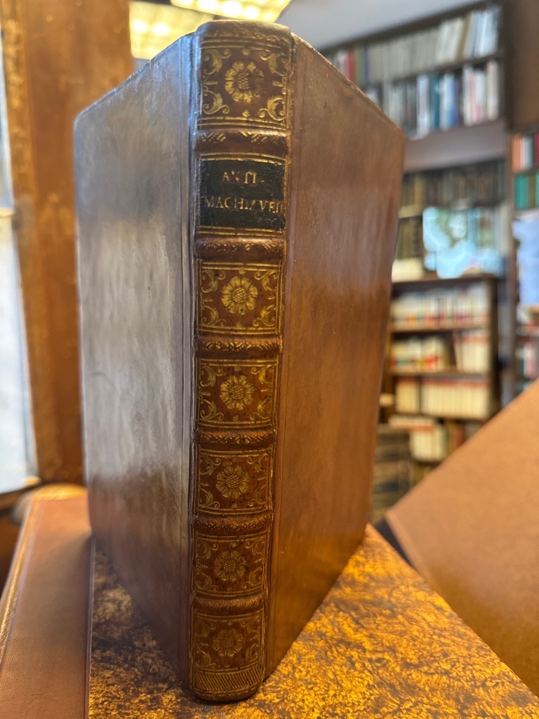Mit gestochener Titelvignette [mit dem Porträt Machiavellis von G. D. Heumann] und gestochener Kopfvignette XIV SS., 2 Bll., 268 SS. Oktavo (20,2 x 12,5 cm.) Ganzlederband der Zeit mit goldgeprägtem Titelrückenschild und sehr reichlicher Rückenvergoldung und maroriertem Farbschnitt.