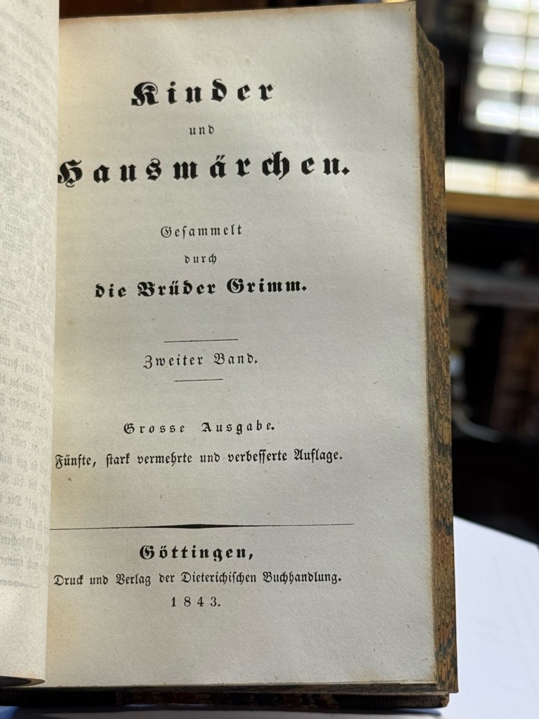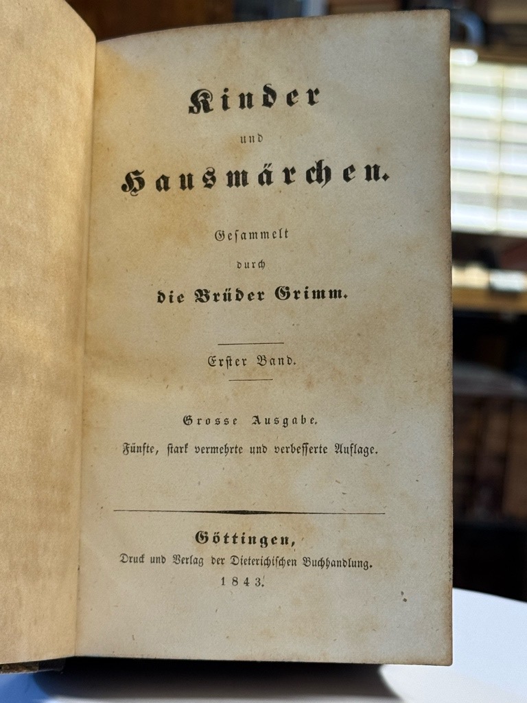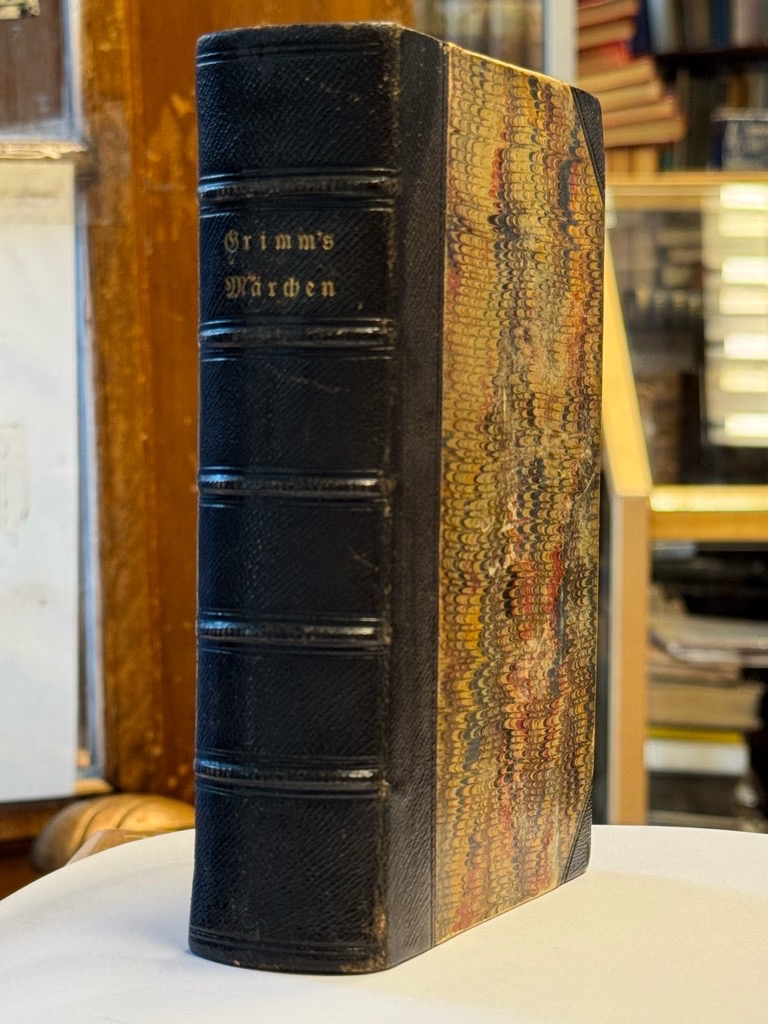 Wegehaupt 831 (gibt nur Band 1 an und irrig 504 S.); Klotz 662; diese Ausgabe nicht bei Seebaß und Göbels; Erste Ausgabe dieser stark erweiterten Sammlung der Märchen durch die Brüder Jakob und Wilhelm Grimm noch zu Lebzeiten. Sehr wohlerhalten und von großer Seltenheit. In dieser von dem Grimms um 50 Märchen erweiterten Sammlung findet sich erstmalig eines der bekanntesten Märchen, nämlich als Nr.187 „Der Hase und der Igel“, der zuvor nur in 1840 in Plattdeutsch im Hannoverschen Volksblatt von Wilhelm Schröder veröffentlicht wurde. „Die fünfte Auflage erschien bereits währen der Berliner Lebensjahre der Brüder Grimm. Die Widmung an Bettina Armin – nach den Widmungen in den ersten und dritten Auflage bereits die dritte Würdigung der engen Vertrauten von Jakob und Wilhelm Grimm – nimmt auf den neuen Wohnort Bezug: “ Diesmal kann ich Ihnen, liebe Bettine, das Buch, das sonst aus der Ferne kam, selbst in die Hand geben. Sie haben uns ein Haus außerhalb der Mauern ausgesucht, wo am Rande des Waldes eine neue Stadt heranwächst, von den Bäumen geschützt, von grünen Rasen Rosenhügeln und Blumengewinden umgeben, von dem rasselnden Lärm noch nicht erreicht:“ (Gemeint war die Behrenstrasse wischen Brandenburger Tor und Gendarmenmarkt) (zitiert nach Katalog der SBB Sign. BIV 1 b, 665 R.). ExLibris auf dem Innendeckel A.I. Tulloch, Shetland, dem Besitzer von Tulloch’s of Shetland, einem Strumpfwaren- und Strickwarengeschäft in Lerwick und der Buchhändlermarke „Williams & Norcate, London“ ebd..