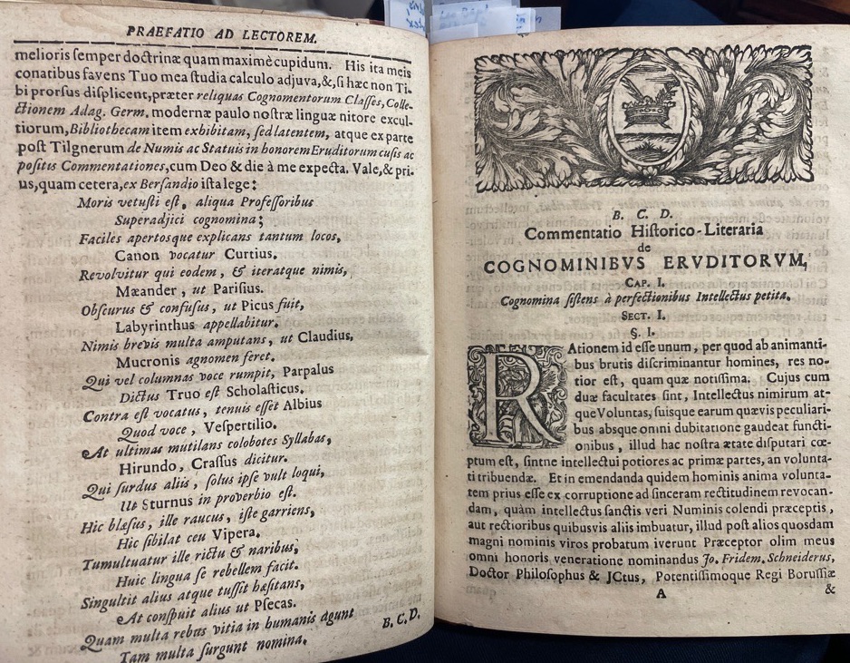 Äußerst seltenes Standardwerk zu den Beinamen (Spitznamen) gelehrter Persönlichkeiten, belegt mit Quellenangaben und Querverweisen, z. Bsp. Albertus BOLSTADIUS Magnus, Bonaventuraa SERAPHICUM DOCTOREM, Thomas von Aquin, Dante ect..Sehr wohl erhalten.