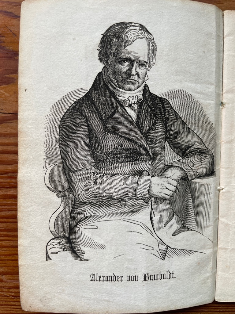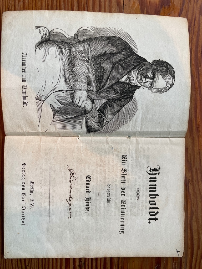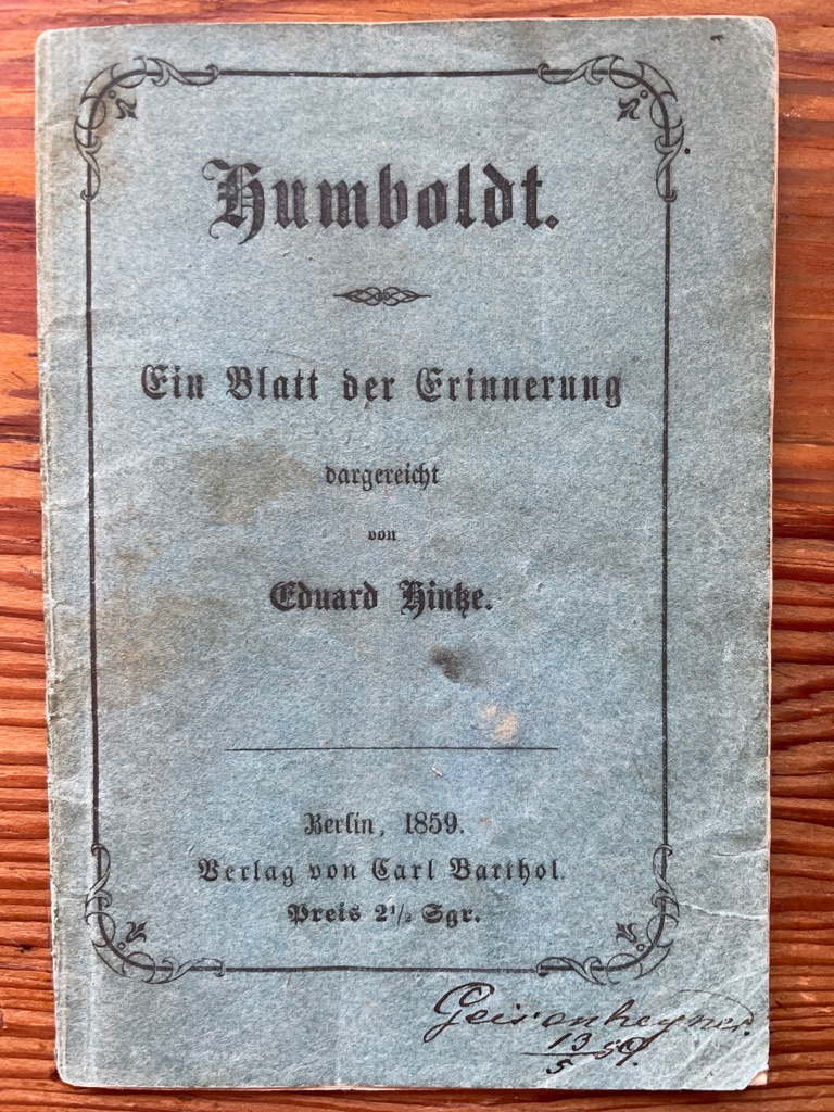 Wenige Wochen nachdem Alexander von Humboldt am 6. Mai 1859 gestorben gab einer seiner größten Verehrer, Eduard Hintze, dieses „Blatt der Erinnerung“ mit diesem gestochenen Porträt in den Druck. Es dürfte die frühste „Biographie“ zu Humboldt sein und ist nur in einer deutschen Bibliothek verzeichnet. In ihm sind Humboldts Lebensgeschichte, Begegnungen und vielfältigen Leistungen beschrieben, vor allem aber der große Eindruck, den der bedeutende Forscher schon auf seine Zeitgenossen machte. So schließt Hintze auch wehmütig „Humboldt ist todt” der Trauer Ruf wird über den ganzen Erdball erschallen und überall wiederklingen in den Herzen der trauernden Menschheit. (…) Wir werden ihn nicht mehr sehen aber unsere Trauer wird sich in die ernste Freude auflösen “ Mit dem Besitzeintrag des Literaturagenten Geysenheyner. Von größter Seltenheit, die empfindliche Broschur in sehr gutem Erhalt.