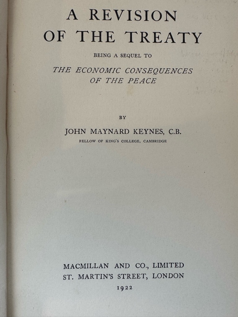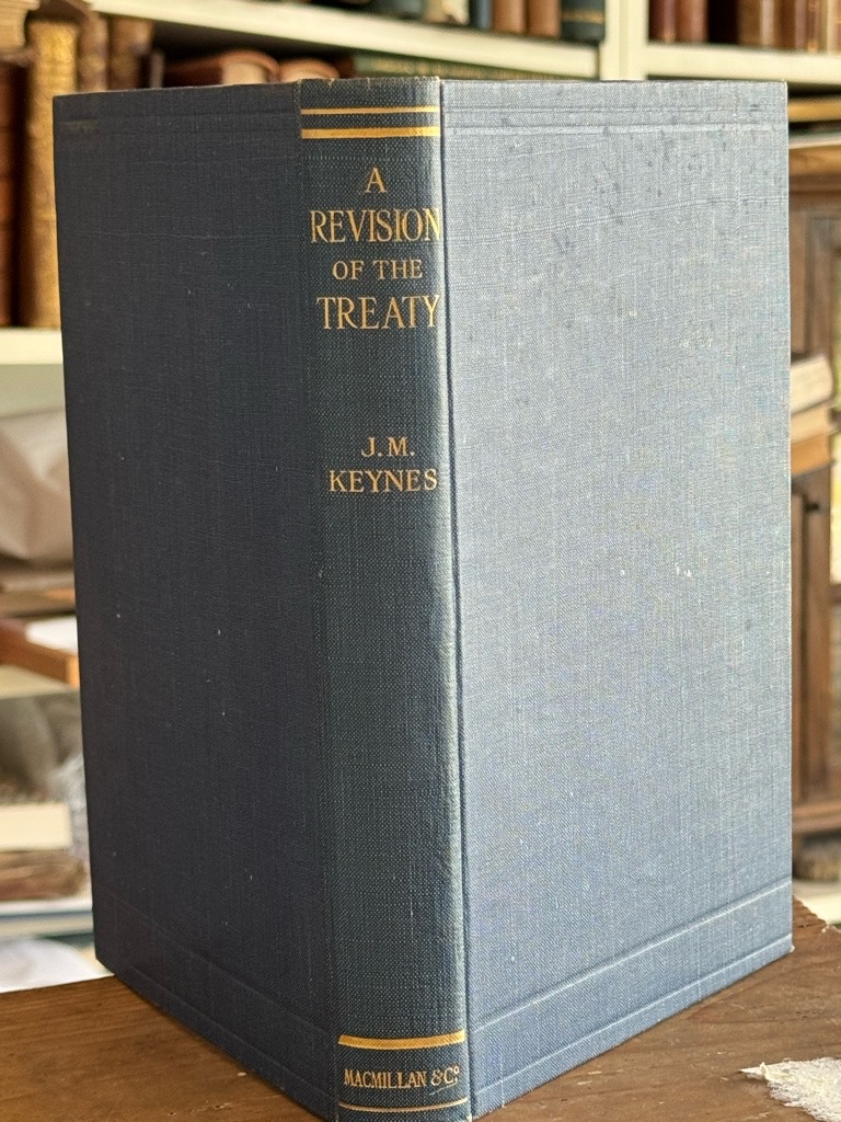 vgl. PMM 423; Erste Ausgabe von Keynes Hauptwerk über den Vertrag von Versailles und die Folgen der darin enthaltenen Reparationszahlungen für die europäische Wirtschaft, frisches Exemplar. „Heute fällt es schwer, die heftige Kontroverse, die diese beiden Bücher [Economic Consequences ist das andere] auslösten, zu begreifen. Als er noch an ihnen schrieb, bewahrheiteten sich bereits viele seiner Voraussagen, und im Licht das darauf folgenden Geschichtsverlaufs hätte die Voraussicht seiner Folgerungen fast unheimlich anmuten können, wenn sie nicht so unausweichlich aus seinen Prämissen entwickelt worden wären‘ (PMM) Mit dem ExLibris von Fredrik Vilhelm Hansen (* 22. Juni 1862 in Stockholm; 26. Oktober 1929) einem schwedischer Bauingenieur.