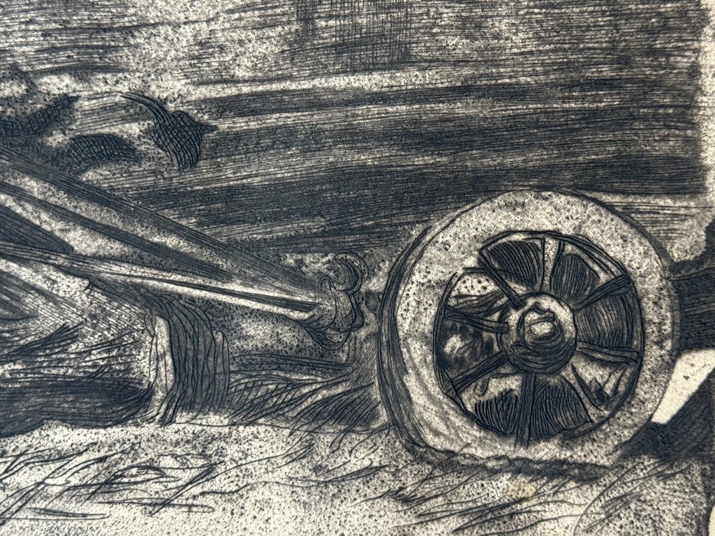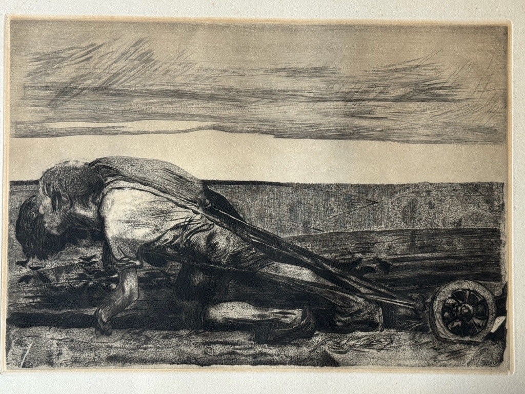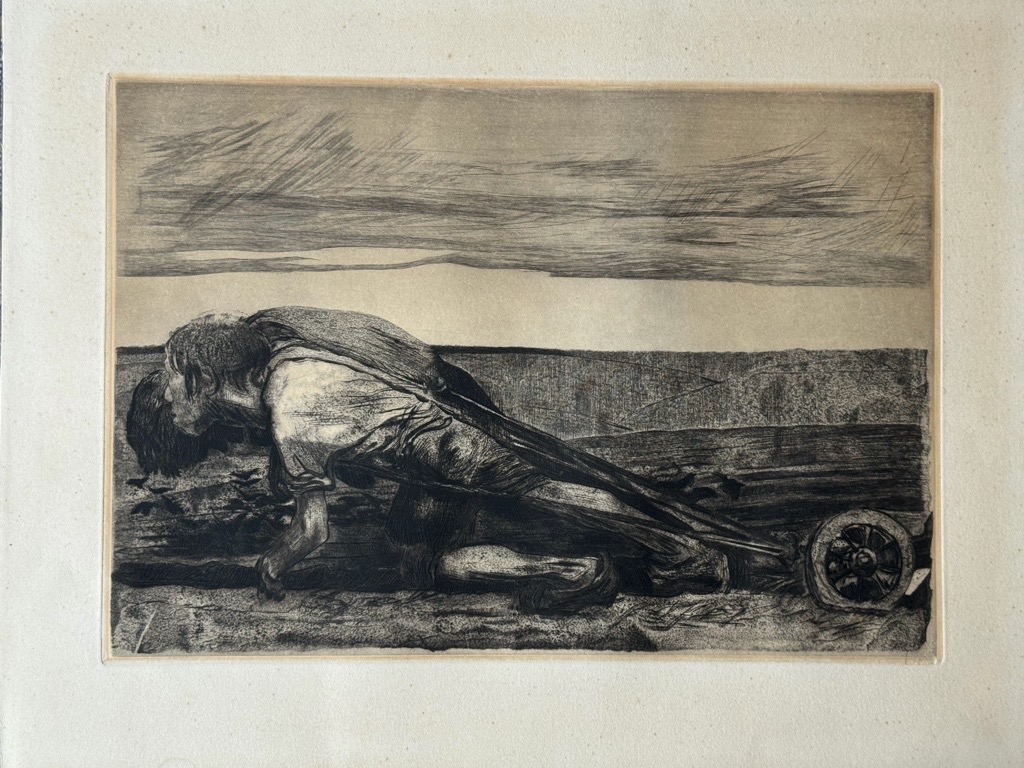 Von dem Knesebeck 99 XII b. Es ist das erste Blatt aus Kollwitz berühmten Zyklus Der Bauernkrieg. Man erkennt die starke, beinahe gar stilisierte Erdverbundenheit des Feldarbeiters, aber auch die enorme Schwere und Mühsal der Arbeit und Verhältnisse. Kollwitz, Käthe Die Pflüger. 1907. Kaltnadelradierung, Aquatinta auf Kupferpapier. 32 x 45,5 cm. (43,5 x 56,5 cm). Mit Blindstempel des Verlegers von der Becke unten rechts im Plattenrand. – Ausgezeichneter, satter und nuancenreicher Druck mit breitem Rand. Von dem Knesebeck 99 XII b. – Blatt 1 aus dem Zyklus Der Bauernkrieg. Mit der gestochenen Jahreszahl unten rechts. Auflage bei von der Becke zwischen 1931 und 1941 entstanden.