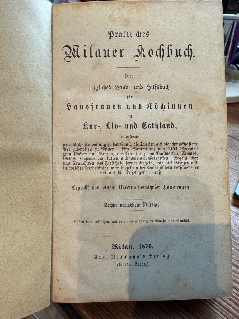 ![<b>[Lucas, Auguste].</b><br />Praktisches Mitauer Kochbuch. Ein nützliches Hand- und Hilfsbuch für Hausfrauen und Köchinnen in Kur-, Liv- und Esthland, enthaltend: gründliche Anweisung zu der Kunst, die Speisen auf die schmackhafteste Art zubereiten zu können; eine Sammlung von 1404 Recepten zum Kochen und Braten, zur Bereitung von Backwerken, Crêmes, Gelées, Gefrorenem, kalten und warmen Getränken; Regeln über das Tranchiren des Fleisches, ferner Regeln, wie viel Speisen und in welcher Reihenfolge man dieselben bei Gastmählern verschiedener Art auf die Tafel geben muß. – Bild 2](https://rarebooks.antiquariat-solder.de/wp-content/uploads/2026/04/35600_2.jpg)