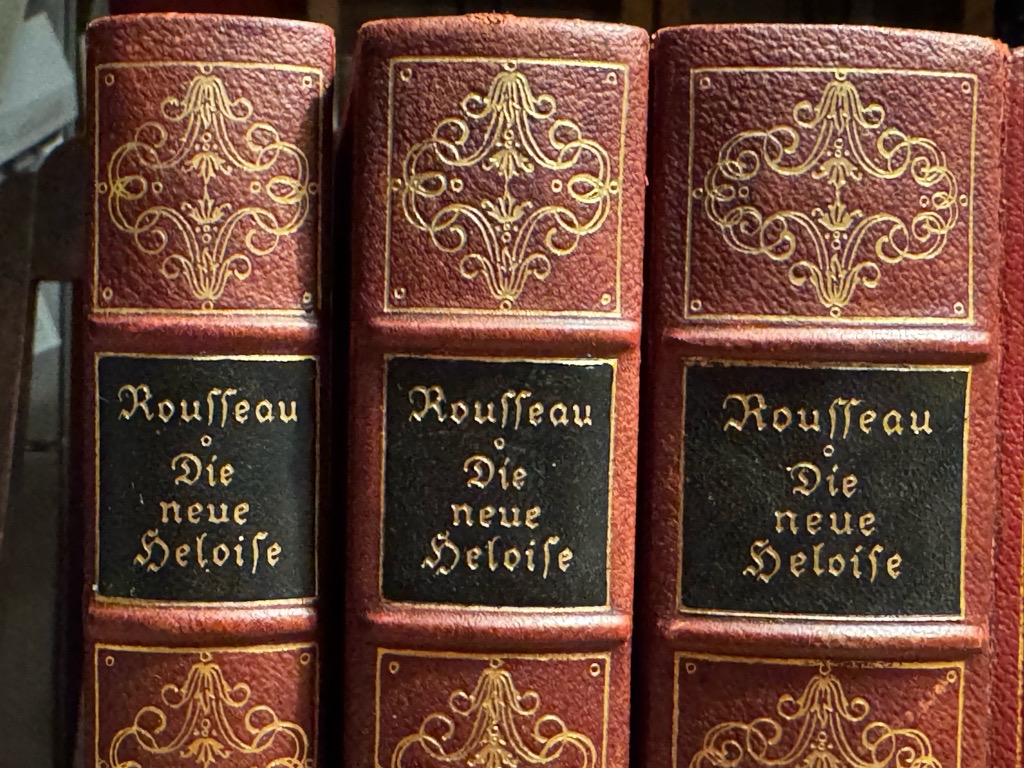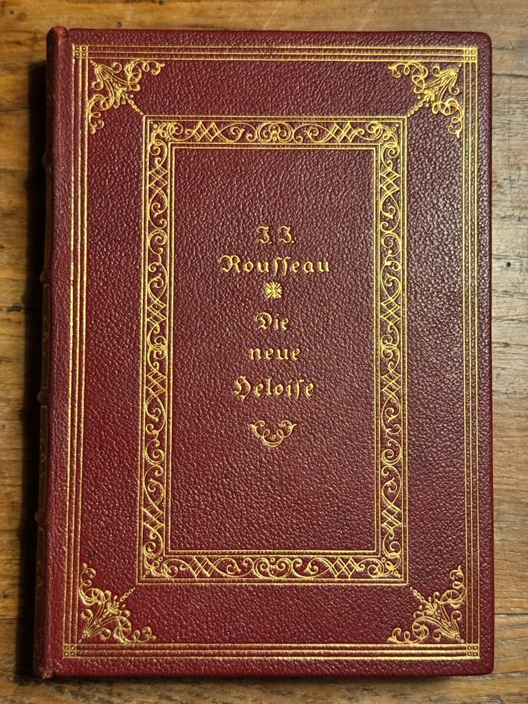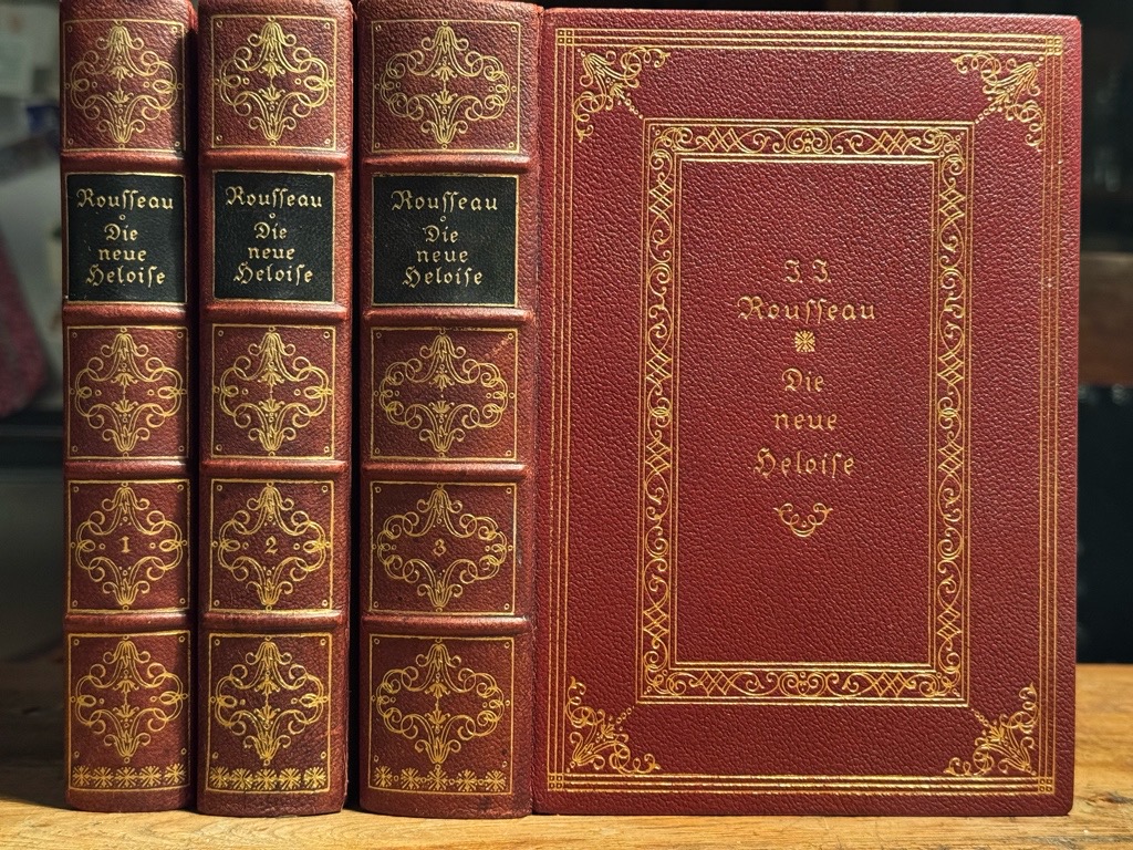 Raabe-Hannich 210, 42 (für Moreck). Vgl. Hayn-Gotendorf V, 561. – Nur II. von nur C Exemplaren der Luxusausgabe, hier das Exemplar von Else Dürr (* 22. August 1867 in Mockau; 27. Januar 1944 in Leipzig) deutsche Frauenrechtlerin, Verlegerin und Stifterin (Name in den Druckvermerk eingetragen). Die Herausgabe und Einrichtung von J.J. Rousseaus Neuer Heloise in drei Bänden besorgte Curt Moreck. Das Werk wurde im Auftrag des Pantheon Verlages, Berlin, in der Reichsdruckerei zu Berlin gedruckt. Von der nummerierten Vorzugsausgabe leiß der Verlag 100 Exemplare I-C auf echten Bütten und 250 auf Exemplare auf Hadernpapier abziehen. Die KUPFER DIESER AUSGABE SIND IN DER REICHSDRUCKEREI VON DEN PLATTEN ABGEZOGEN WORDEN. Neudruck unter teilweiser Bneutzung der deutschen Ausgabe von 1761. Tadellose Exemßlar dieser unauffindbaren Luxusausgabe, geschützt in handgefertitgem Schuber.