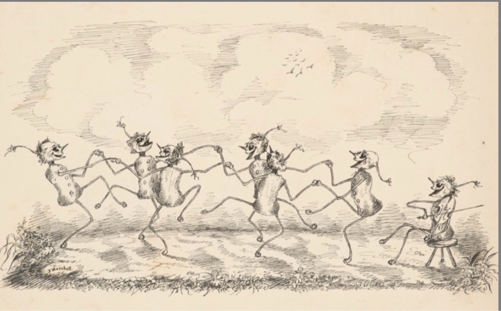 Anthropomorphismus – – F. Marshall. Sammlung von 17 feinen Federzeichnungen vorwiegend mit vermenschlichten Tierdarstellungen.
