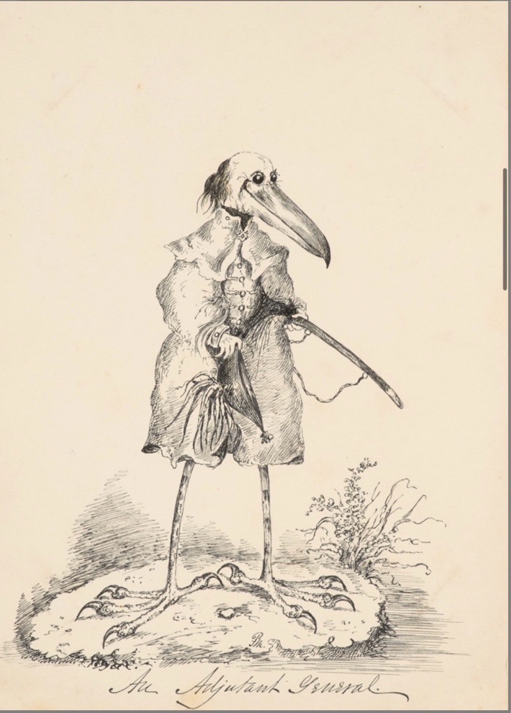J. Busse, Internat. Handbuch aller Maler und Bildhauer des 19. Jh., S. 811 Nr. 52154, 52155. – (Evt. auch: Graves, Dictionary of Artists who have exhibited works in the Principal London Exhibition from 1760 to 1893, compiled by Algernon Graves, F.S.A. 3rd ed. 1901, Kingsmead Reprints, Bath 1973). – Tls. vom Künstler dat., monogrammiert u. bezeichnet oder mit passender Sentenz versehen. Dargestellt werden tanzende Vögel, musizierender Frosch, betrübte Karotte, Portraits von Vögeln mit Hüten, langbeiniger Vogel (Marabu) als An Adjutant General u.a. -Beiliegend zeitgenöss. (eh.?) hs. Notiz auf Karton: Original Etchings by F. Marshall. – Tls. gering gebräunt u. vereinzelt stockfleckig, insg. wohlerhalten. Anthropomorphism. – Collection of 17 fine ink drawings, mainly depicting humanised, on paper and cardboard. Mounted or inserted in folded laid paper. In later marbled half cloth portfolio with gilt embossed title and mount. leather label with gilt-stamped title. – Partly dated, monogrammed and inscribed by the artist or with a suitable sentence. – Depicting dancing birds, a frog making music, a sad carrot, portraits of birds with hats, a long-legged bird as ‚An Adjutant General‘, etc. – Enclosed contemporary (eh.?) handwritten note on card: ‚Original Et Et. Note on card: ‚Original Etchings by F. Marshall‘. – Partly slightly browned and sporadically foxed, overall well preserved.