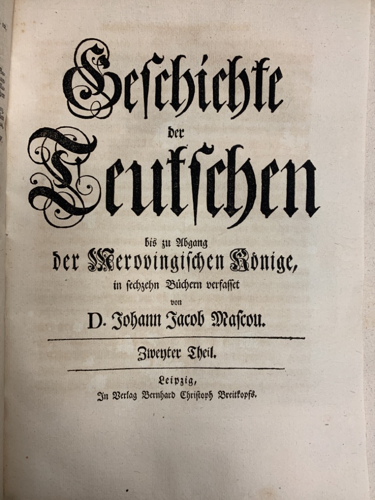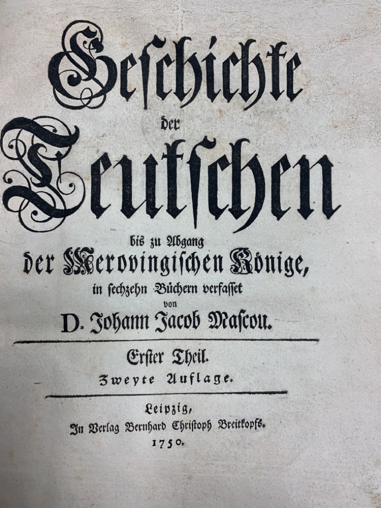 vgl. Ebert 13340. Brunet III 1514. DW 1768. Ein Meisterwerk der deutschen Historiographie. Darstellung der ersten 8 Jahrhunderte der deutschen Geschichte. „Es ist grundlegend und für alle späteren Bearbeitungen dieser Zeit maßgebend“ (Wegele S. 675). Durch den langen Erscheinungszeitraum selten wie hier vollständig. Der übersichtliche Satz mit seiner deutlichen Unterscheidung von Text, Fußnoten und Marginalien sowie der großzügige Druck auf breitrandigem Papier, machen das Werk zu einem Muster für eine wissenschaftliche Ausgabe. Die inhaltlich bedeutend und um zwei Karten erweiterte zweite Auflage Vgl. ADB XX, 556f., mit ausführlicher Würdigung des erstmals 1726-37 erschienenen epochemachenden Werkes. – Vgl. ADB XX, 556f., mit ausführlicher Würdigung des erstmals 1726-37 erschienenen epochemachenden Werkes. Formvollendet gedruckt von Leipzigs großem (Musikalien-) Drucker Breitkopf.
