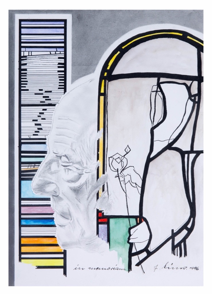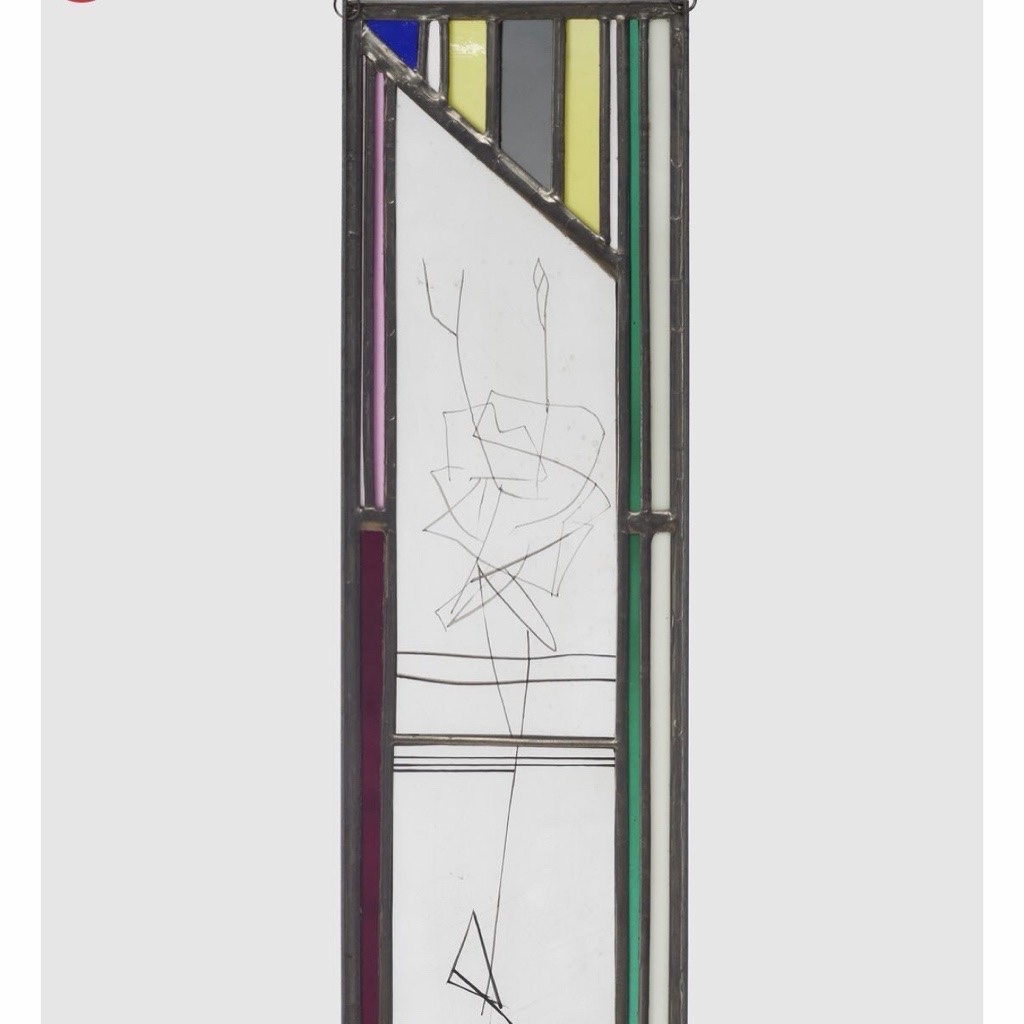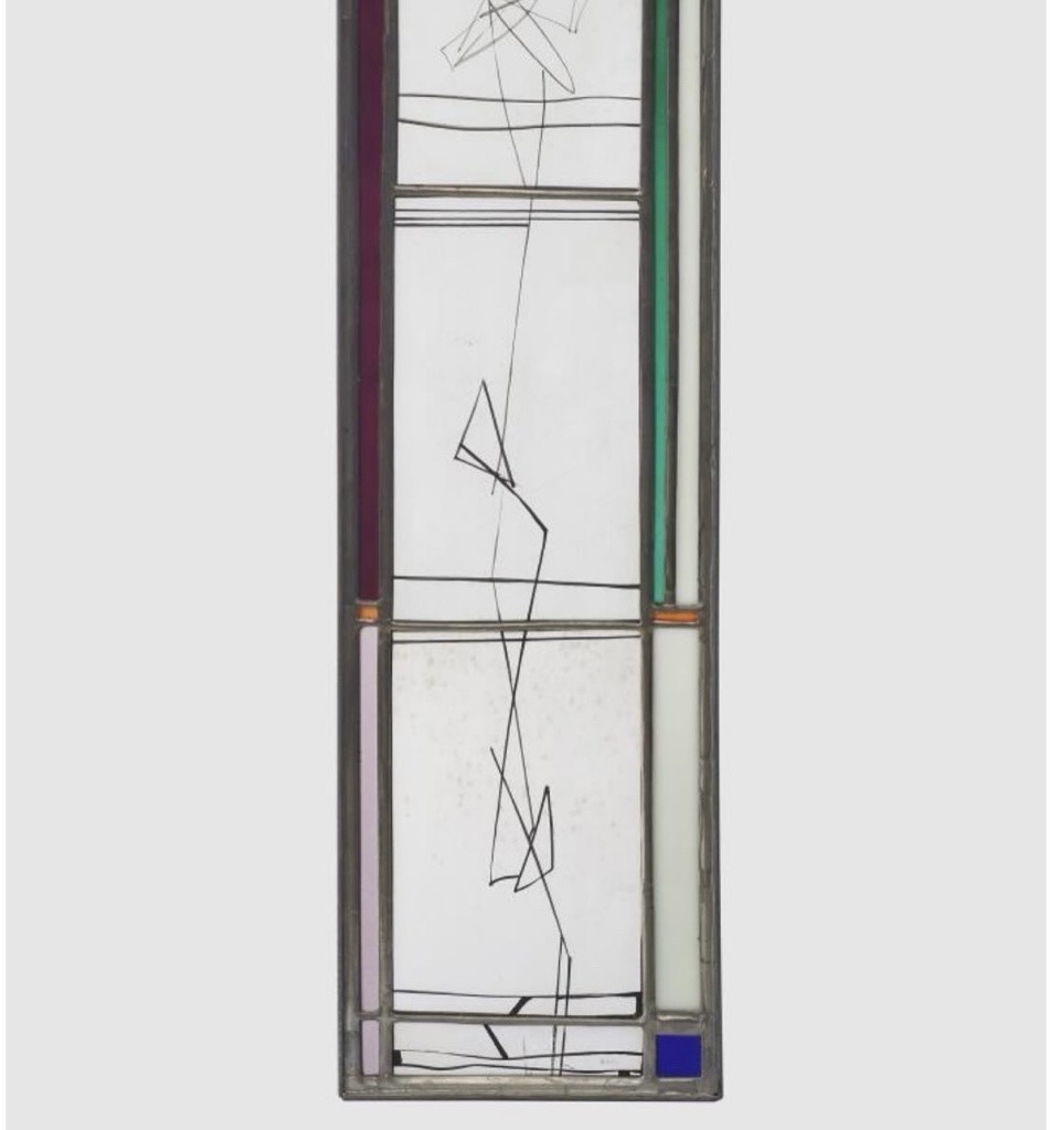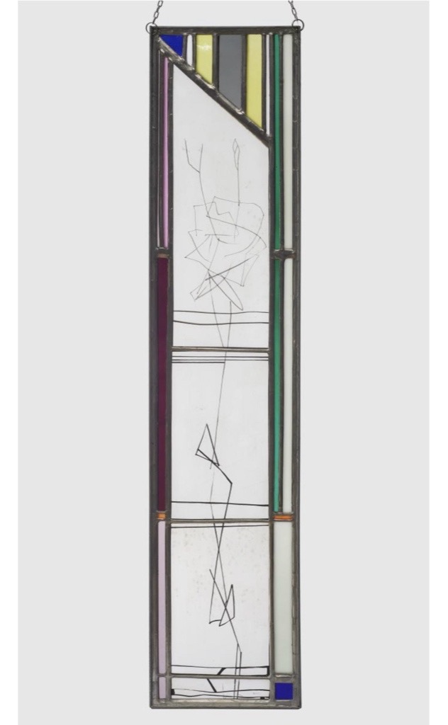 Bleiverglastes Fenster, polychrom, teils mit Schwarzlot bemalt, in Metallrahmen, mit Hängevorrichtungen. Monogrammiert. Dazu: In Memoriam (Porträt Georg Meistermanns vor Glasfenstern). 1996. Aquarell und Bleistift von A. Lück. Passepartoutausschnitt ca. 40 x 28 cm. Fest unter Passepartout montiert und nicht außerhalb des Rahmens untersucht. – Rückwand mit der Kopie eines Dankesschreibens von Edeltrud Meistermann vom 24.03.1997.