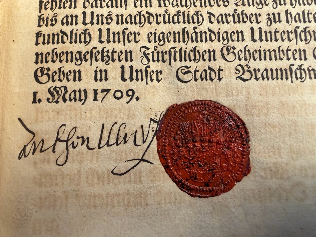 VD18 90785088; VD18 90785096; Mit dem Wachs-Siegel und der Unterschrift von Anton Ulrich auf Blatt 3 (Exemplar von Anton Ulrich?), Bibliotheksstempel (Braunschweig Lüneburgusches Collegium mit dem Wappen von Anton Ulrich) auf dem Titelblatt. Durchgehend leicht gebräuntes, aber sauberes Exemplar, wenige Anstreichungen von alter Hand..