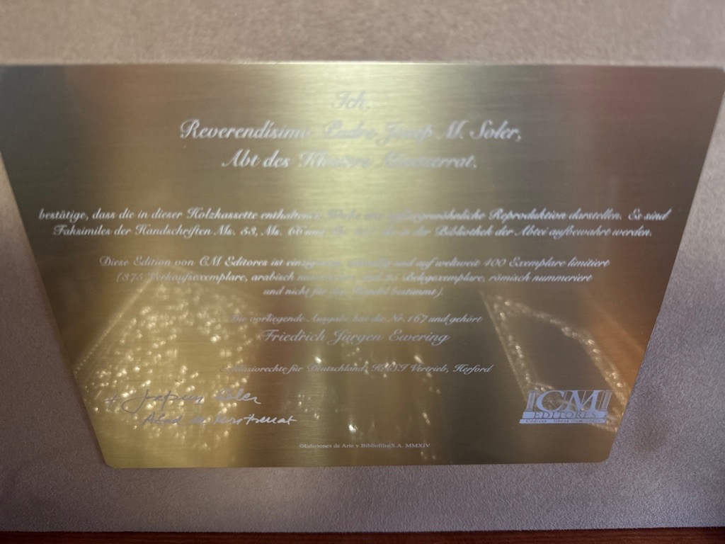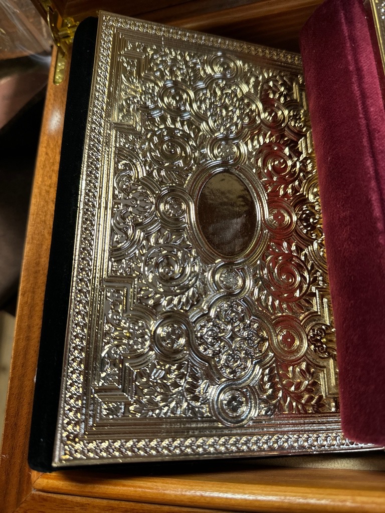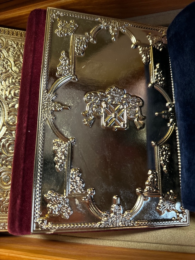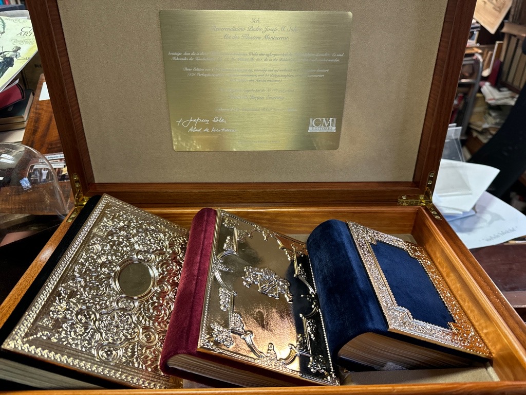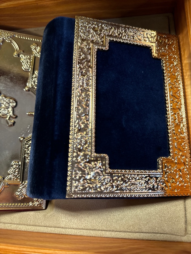 3 Samteinbände mit geprägten goldfarbenen Metallplatten auf Vorder- und Rückendeckeln Formate: 14 x 11 cm; 17,5 x 12,5 cm; 19,5 x 14 cm. , eingelegt in gefütterter Holz-Kassette. (14 x 11 cm; 17,5 x 12,5 cm; 19,5 x 14 cm.), eingelegt in gefütterter Holz-Kassette mit Gazeehandschuhen(neu verpackt).