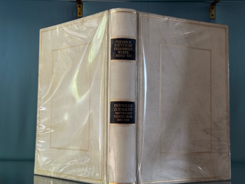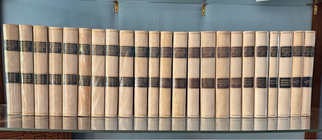 Nr. 101 von 200 numerierten Exemplaren dieser Vorzugsausgabe auf Hadernpapier und in Ganzpergament gebunden. Einbandentwurf von Ottomar Starke. Druck von W. Drugulin, Leipzig. Die Monumentalausgabe der Werke Niezsches liegt hier in einem einmaligen Zustand. vor. Gedruckt auf schwerem Papier und in den Pergamentbänden ist diese Produktion sicherlich als einer der buchkünstlerischen Höhepunkte der ersten Hälfte des 20. Jahrhunderts zu bezeichnen. Über den wissenschaftlichen Wert der Ausgabe kann ebenfalls kein Zweifel bestehen. Die Herausgabe besorgte Richard Oehler, der Vetter Nietzsches, der durch seine abgesicherten Nietzsche-Editionen berühmt wurde. »Einen weiteren Vorzug der Musarionausgabe bildet die Hinzufügung eines Jugendschriftenbandes (mit einer großen Anzahl bis dahin unveröffentlichter Abhandlungen, Studien und Skizzen des jugendlichen Nietzsche) als ersten und eines autobiographischen als letzten der Gesamtreihe« (aus dem Vorwort von Richard Oehler). Mit dem Namensregister zur Gesamtausgabe in Band 21, Bände 22 und 23 mit dem Sachregister. Außergewöhnlich wohlerhaltenes Exemplar, in diesem Zustand unauffindbar.
