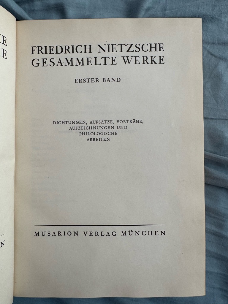 Nr. 101 von 200 numerierten Exemplaren dieser Vorzugsausgabe auf Hadernpapier und in Ganzpergament gebunden. Einbandentwurf von Ottomar Starke. Druck von W. Drugulin, Leipzig. Die Monumentalausgabe der Werke Niezsches liegt hier in einem einmaligen Zustand. vor. Gedruckt auf schwerem Papier und in den Pergamentbänden ist diese Produktion sicherlich als einer der buchkünstlerischen Höhepunkte der ersten Hälfte des 20. Jahrhunderts zu bezeichnen. Über den wissenschaftlichen Wert der Ausgabe kann ebenfalls kein Zweifel bestehen. Die Herausgabe besorgte Richard Oehler, der Vetter Nietzsches, der durch seine abgesicherten Nietzsche-Editionen berühmt wurde. »Einen weiteren Vorzug der Musarionausgabe bildet die Hinzufügung eines Jugendschriftenbandes (mit einer großen Anzahl bis dahin unveröffentlichter Abhandlungen, Studien und Skizzen des jugendlichen Nietzsche) als ersten und eines autobiographischen als letzten der Gesamtreihe« (aus dem Vorwort von Richard Oehler). Mit dem Namensregister zur Gesamtausgabe in Band 21, Bände 22 und 23 mit dem Sachregister. Außergewöhnlich wohlerhaltenes Exemplar, in diesem Zustand unauffindbar.