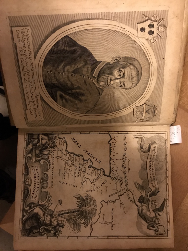 16 nn ( Praef.), 565 S. 18 nn ( ind.) 252 S. mit einem gestochenen Porträtfrontispiz, einer Syrienkarte und einem mehrfach ausfaltbaren Tafel und zahllosen Münzkupfern im Text 4° Ganzpergament der Zeit.