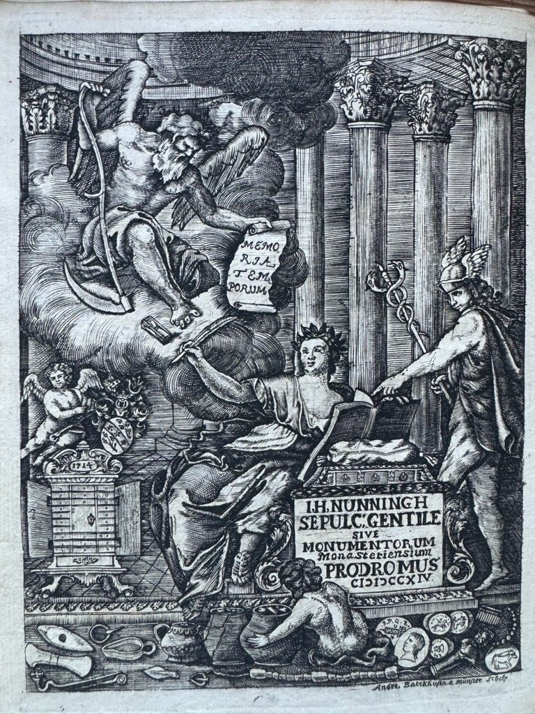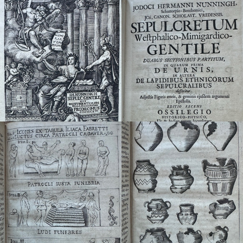 [15 (gestochenes Frontispiz) Bll.] 102 [i.e. 100 Paginierungsfehler, springt von 75 auf 78] S, mit 7 gestochenen, ganzseitigen Kupfertafeln.; 58 S. [3] Quarto. Eleganter blindgeprägter Ganzpergamenteinband der Zeit mit handschriftlichem Rückentitel.