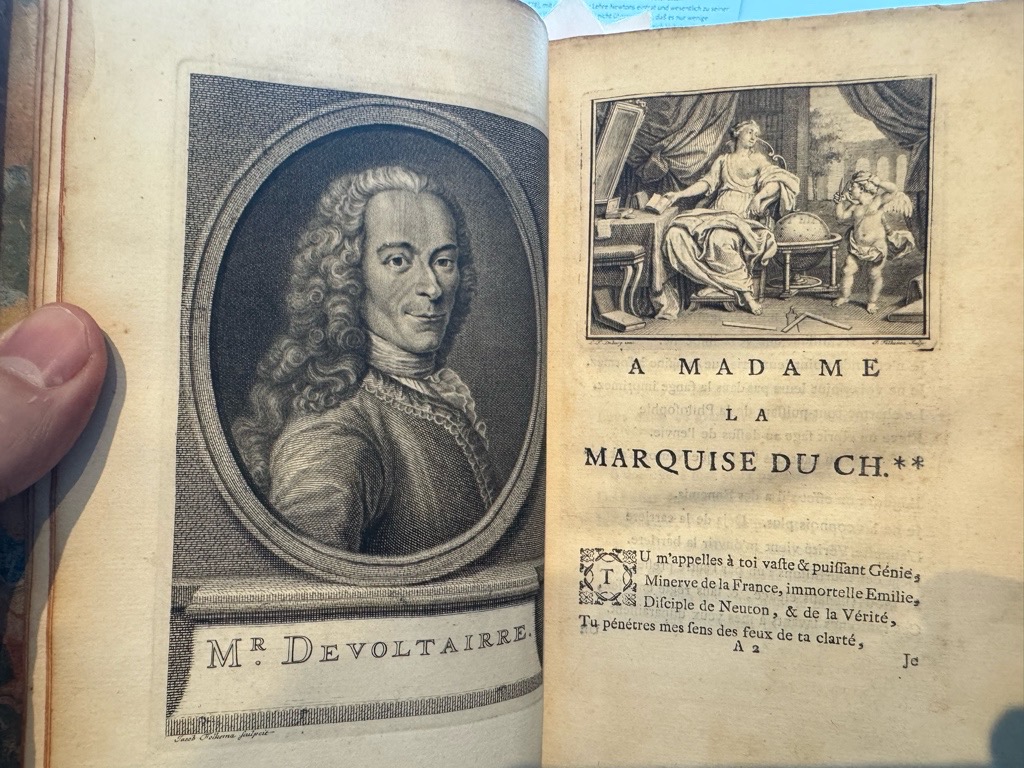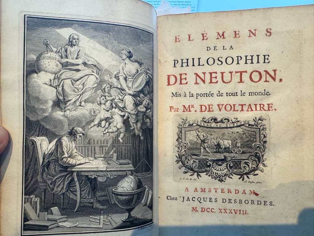 Cohen-de Ricci 1037f.; Sander 1996; Gray, Newton 155; vgl. PMM 97; Zweiter – von Voltaire bevorzugter – Druck der ersten Ausgabe, die gleichzeitig auch bei Etienne Ledet in Amsterdam erschien. Eine der bedeutendsten naturphilosophischen Schriften Voltaires (1694-1778), mit der er für die Lehre Newtons eintrat und wesentlich zu seiner Verbreitung beitrug. „Die Principa sind ein schwieriges Werk, und so ist es nicht überraschend, daß es nur wenige Zeitgenossen vollständig gelesen haben … Einer seiner berühmtesten Verfechter war in Frankreich Voltaire, dessen ‚Elémens de la philosophie Neuton‘ von 1738 in vielen Kreisen gelesen wurden.“ (Carter-Muir, 304). Die Abhandlung enthält u. a. die Quelle für die Anekdote, Newton habe die Schwerkraft durch den Anblick eines fallenden Apfels erkannt. Die ornamentalen Kupfer stammen u. a. v. L.-F. Dubourg, J. Folkema, F. M. La Cave, B. Picart, J. v. Schley. – Hervorragendes Beispiel für die französische Buchillustration des Rokokos, in dem sich Illustrationen und aufgeklärte Naturwissenschaften harmonisch miteinander verbinden.