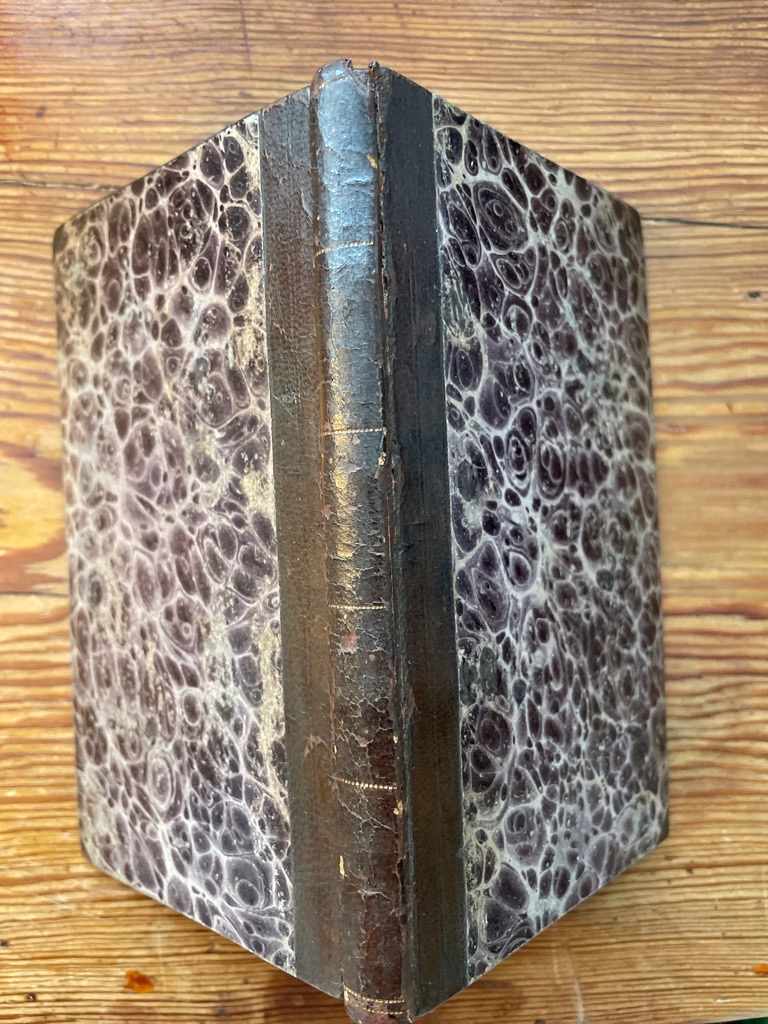 2 Bl., 142 S., 1 Bl. Klein-Oktav. Halblederband der Zeit mit Buntpapierbezug.