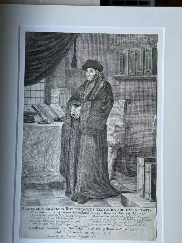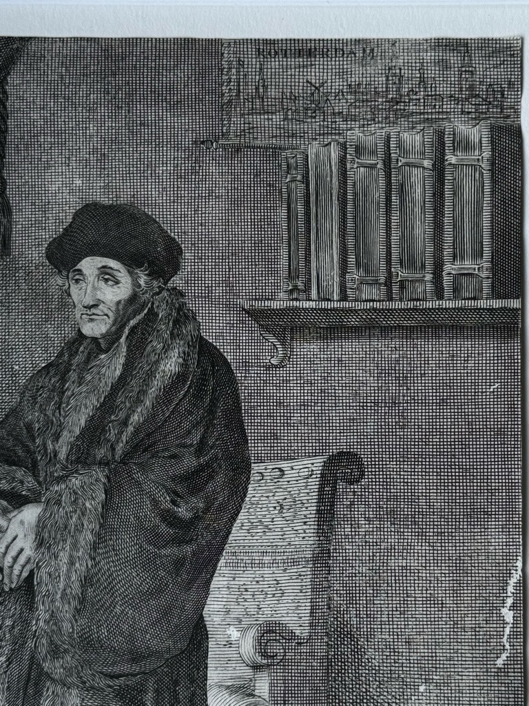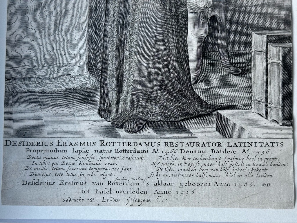 Van Someren 1679.; A.v.Wurzbach 1,702 (Nr. 8).; Hollstein D.9,79 (Nr. 35).; Diepenbroick 7437.; ThB 17,403. Wolffenbüttel 5995 / II 1452.11; Sauer AKL, 75, 321; Äußerst seltenes Kupferstich-Porträt von Erasmus von Erasmus von Pieter Holsteyn ( Holsteijn) nach dem Portät von Hans Holbein d. J. mit zweisprachigem Widmungsgedicht von Jacobus Heiblocq (16231690), Rektor in Amsterdam: Ganze Figur nach l. stehend im Arbeitszimmer, o. l. Vorhang, darunter Fenster u. bedeckter Tisch, darauf Tintenfaß mit Schreibfeder u. auf Pult liegendes aufgeschlagenes Buch zwischen 3 liegenden u. 3 stehenden Büchern, hinter dem Lehnstuhl an der Wand o. r. Bücherbord, darüber Ansicht von Rotterdam (vgl. den Calvin-Stich A 3326), u. r. auf einem Tischchen 2 weitere stehende Bücher. Unter dem Bild 2zeil. lat. Legende DESIDERIUS ERASMUS ROTTERDAMUS RESTAURATOR LATINITATIS | Propemodum lapsae [der Wiederhersteller der beinahe am Boden liegenden lateinischen Schreibart] natus Rotterdami Ao. 1466. Denatus Basileae Ao. 1546. Darunter l. 4 lat. distich. Verse von Jacobus Heiblocq (16231690), Rektor in Amsterdam: Docta manus totum sculpsit, spectator! Erasmum, En tibi! qui Bezae dimidiatus erat. De medio totum fecerunt tempora, nec jam Dimidius, toto totus in orbe viget. (Eine kunstgeübte Hand hat hier für dich, Betrachter, den Erasmus in ganzer Figur gestochen, der für Beza noch ein halber war [vgl. die Beza-Verse zu A 5970]. | Aus einem halben haben die Zeiten ihn zu einem ganzen gemacht, und nicht mehr halb, sondern als Ganzer blüht er auf der ganzen Welt). R. 4 etwa sinngleiche niederl. Verse: Ziet hier door teekenkunst Erasmus heel in prent; Hy wierd, int eerst, maer half gestelt in Bezas handen: De tijden maaken hem van half geheel; bekent Is hy nu, niet meer half, maar heel in alle landen. (Seht hier durch Zeichenkunst Erasmus ganz im Druck; er wurde zuerst nur halb dargestellt in Bezas Händen [B. als Kupferstecher mißverstanden?]. Die Zeiten machen ihn aus einem halben zu einem ganzen; bekannt ist er nun nicht mehr halb, sondern ganz in allen Ländern).