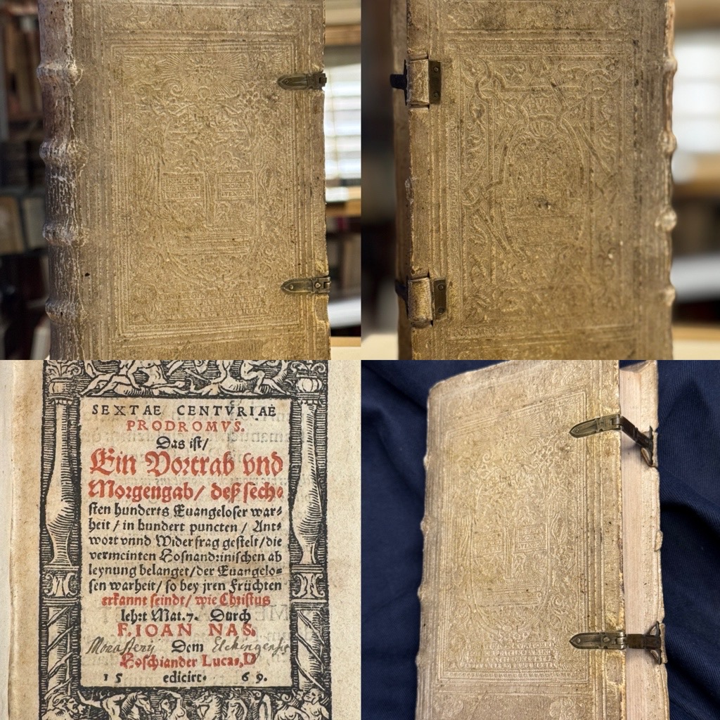VD 16, N 101; Goed. II, 487, 2f.; Stalla 594. – Prächtiges Exemplar der sechsten und letzten Centurie, die sich hauptsächlich mit Lukas Osiander dem „Hosenanderlein, Hosenlukas, Hosenluchs“, wie Nas ihn nennt, beschäftigt. Der Autor Johannes Nas (1834-1590) war ursprünglich Franziskaner und wandte sich dann für einieg Zeit der Reformation zu, um daraus um so entschiedener als Gegenreformator und Kontroverstheologe für die katholische Kirche einzutreten. Er geriet in eine lebhafte und polemisch geführten Streit mit dem lutherischen Theologen Lucas Osiander d.Ä.. Osiander nannte Nas einen „verblendeten Schwätzer und Lügenprediger des Antichrists“, Nas Osiander als „Rottenführer, Kind des Irrtums und verulkte dessen Namen zu Hosiander“. Inhaltlich geht es um die klasssichen Streitthemen wie Rechtfertigungslehre, die Sakramente und die Autorität des Papstes. Der sehr gut erhaltene Einband aus der Werkstatt H.V.M. (i.e. Hans Ulrich Mor, Ulm), (ID w004510) und zeigt auf dem Vorderdeckel: Kruzifix | mit Bundeslade und Heiliggeisttaube SIC DEVS DIL. MVD VT OMNI // S QVI CREDIT IN EVM: NO // N PEREAT SED HABET // VITAM AETERNAM. p002972 / Haebler Nr. I 459, I und auf der Rückseite Christus und die Samariterin: „VIE CHRISTVS MIT // DEM SAMARISCH // EN WEIB RET“ 140 (p002987 / Haebler I 459, II. Haebler ordnet den Buchbinder örtlich an der Grenze zwischen Baden und Württemberg zu. Literaturverweise: Haebler I, 458-460 Schmidt, Adolf: Zur Geschichte deutscher Buchbinder im 16. Jahrhundert. In: Beiträge zum Rollen- und Platteneinband im 16. Jahrhundert. Leipzig 1937, S. 1-109, hier S. 62-63.