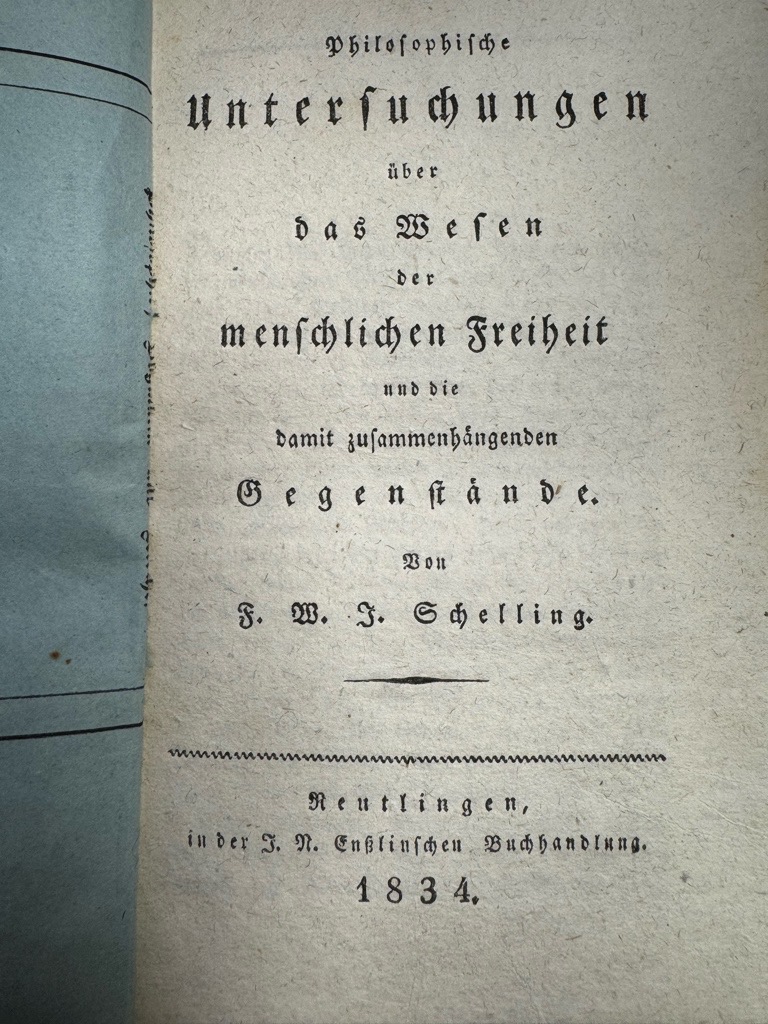Ziegenfuss II, 438; Jost 53; „Erste Separatausgabe, erschien erstmals 1809 in den „“Philosophischen Schriften““. – „Einer der tiefsten Texte der deutschen Philosophie“ Martin Heidegger über dieses Buch über das er 1936 eine Vorlesung hielt. Schellings Freiheitsbegriff hat eine kaum zu überschätzende Wirkungsgeschichte und darf als eine der wichtigsten Vorgriffe aus den Existenzialismus gelten und hatte großen Einflus etwa auf Kierkegaard und eben Heidegger, aber auch auf moderne Freiheitstheorien. Sehr frisches, unaufgeschnittenes Exemplar.