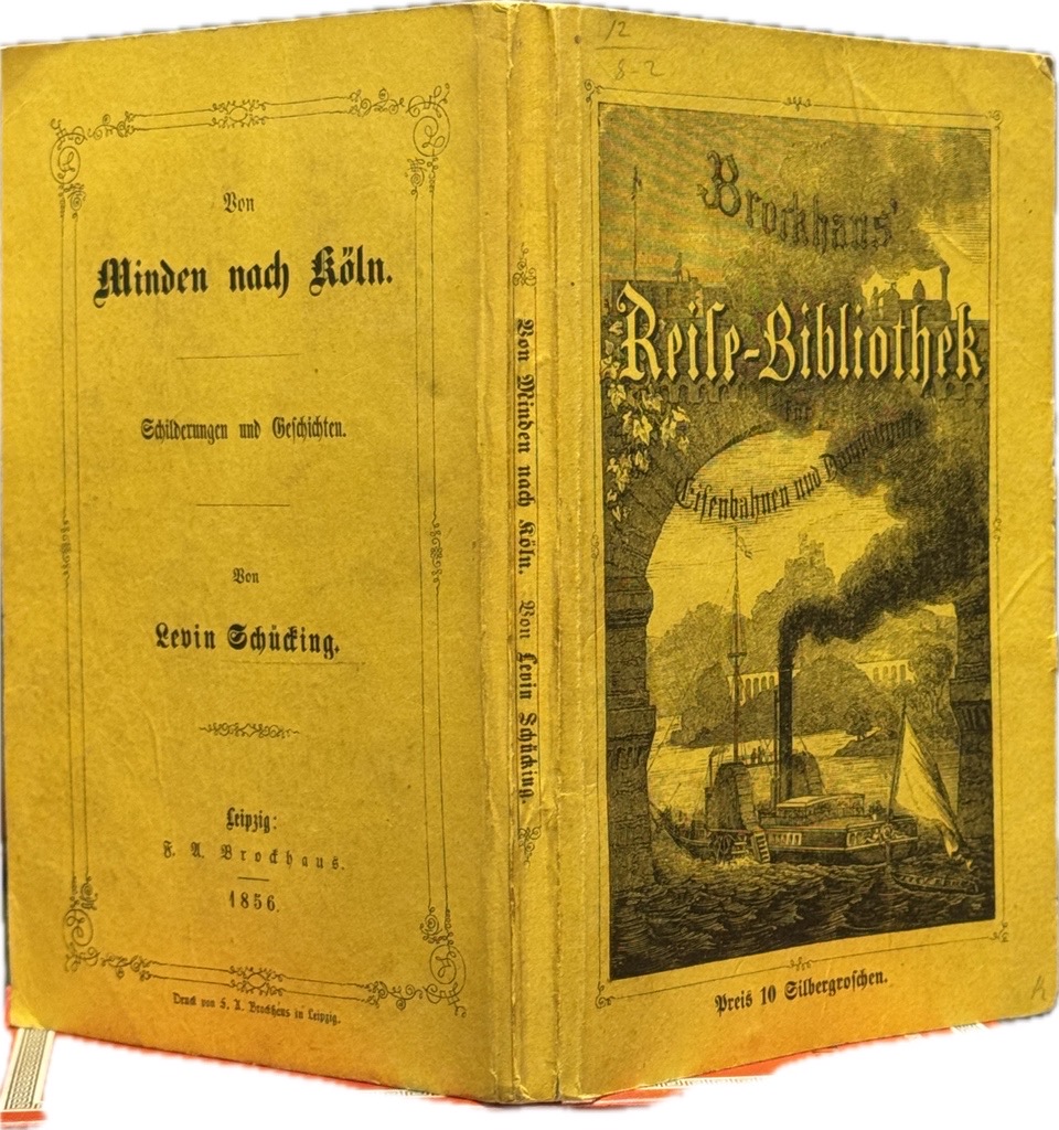 Raßmann I, 306; W/G² 1397, 27; Erste Ausgabe, sehr selten.Levin Schücking, der nicht nur in unseren Breiten hohe Anerkennung genießt, veröffentlichte in der Reise-Bibliothek für Eisenbahnen und Dampfschiffe (!) des Brockhaus Verlages weniger die heute üblichen Beschwerde Suaden über die Vorläufer der @deutschebahn, sondern begeistert seine Leserschaft ausführlich für die Landschaft, Geschichte, Menschen und Sagen des westfälisch-rheinischen Raumes Minden, Enger, Bielefeld (damals gab es die Stadt wohl noch ??), Oelde, Hamm und die Mark Birkenbaum und westfälische Sehergabe (!), Dortmund, Ruhr- und Lennetal, Essen, Duisburg, Calkum, Düsseldorf. Die hübsche Deckel Illustration zeigt ein Dampfschiff unter einer Brücke mit Eisenbahn. Dieses äußerst seltene Druckwerk, noch dazu in der reizenden Originalbroschur, ist zum ersten Mal in dreißig Jahren bei uns aufgetaucht.